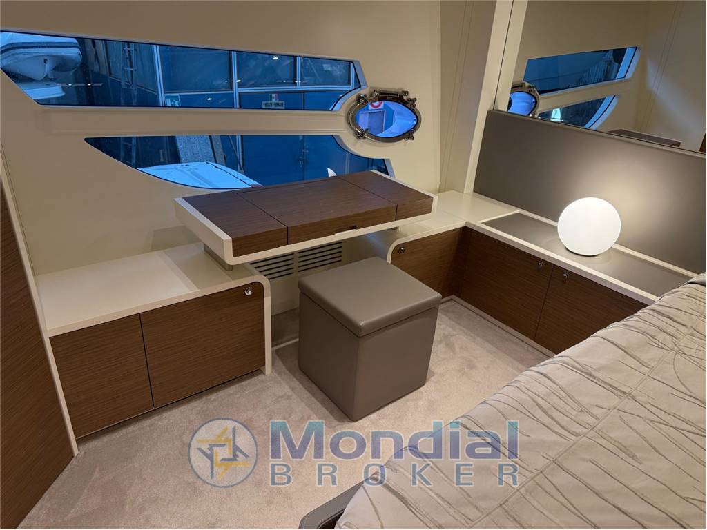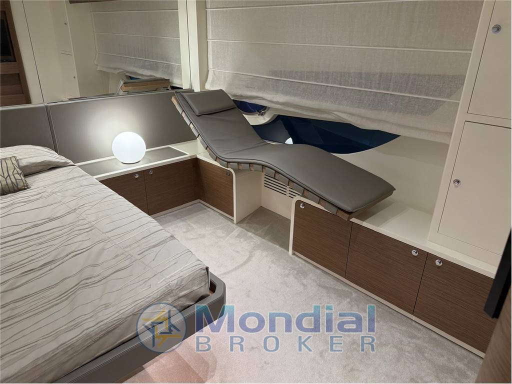 Ampia dinette centro barca, cabina armatoriale a poppa a tutto baglio con chaise longue e servizio riservato.