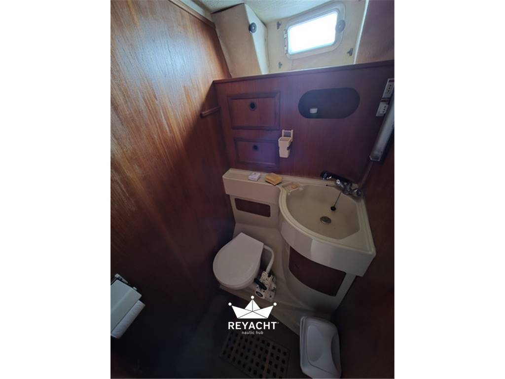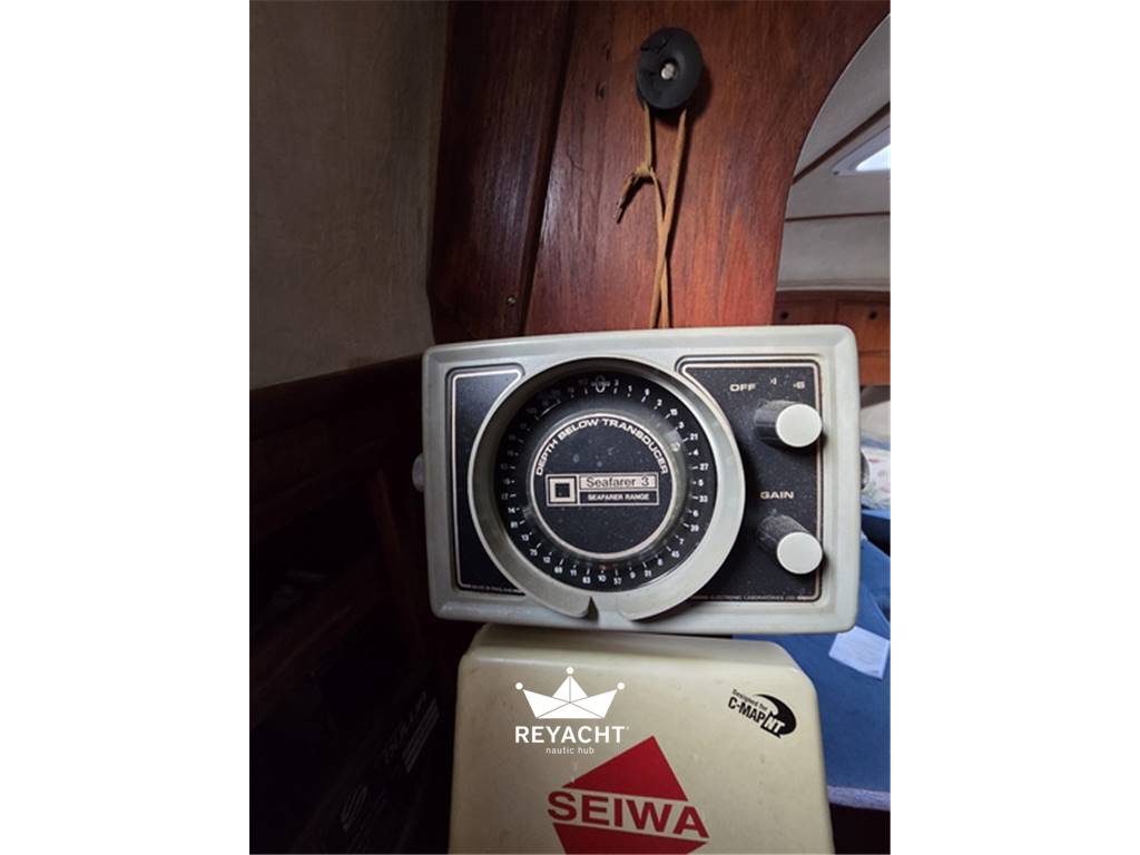 L’intérieur d’origine S&S, récemment modernisé, présente un aménagement fonctionnel comprenant une cuisine équipée (cuisinière à gaz Can avec four, évier inox), revêtement blanc aux parois et planchers en contreplaqué de teck, idéal pour la navigation au long cours. La coque en fibre de verre renforcée est exempte d’osmose, le cockpit en teck est protégé et le poste de barre complet propose une roue ou une barre de secours.