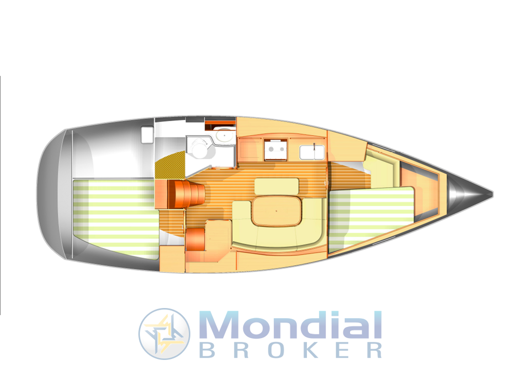 Interni color ciliegio, versione 2 cabine 1 bagno + dinette trasformabile. Entrando in dinette sulla dritta troviamo l’angolo carteggio, un divano a U che ne centro vi è un tavolo che può ospitare 6/8 commensali per chiudere il cerchio c’è una piccola panca. Sulla sinistra c’è il bagno generoso con la doccia separata, adiacente ad esso è posizionata la cucina a murata composta da lavello con 2 vasche, frigorifero, 2 fuochi con forno basculante a gas. A prua c’è la cabina dell’armatore composta da un letto matrimoniale alla francese sulla murata di dritta, di fronte un divanetto e un armadio. A poppa c’è la seconda cabina con letto matrimoniale il terzo letto lo si ottiene in dinette.
