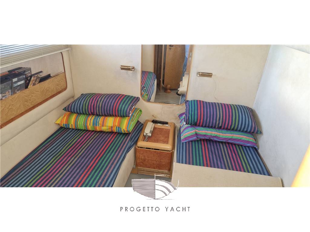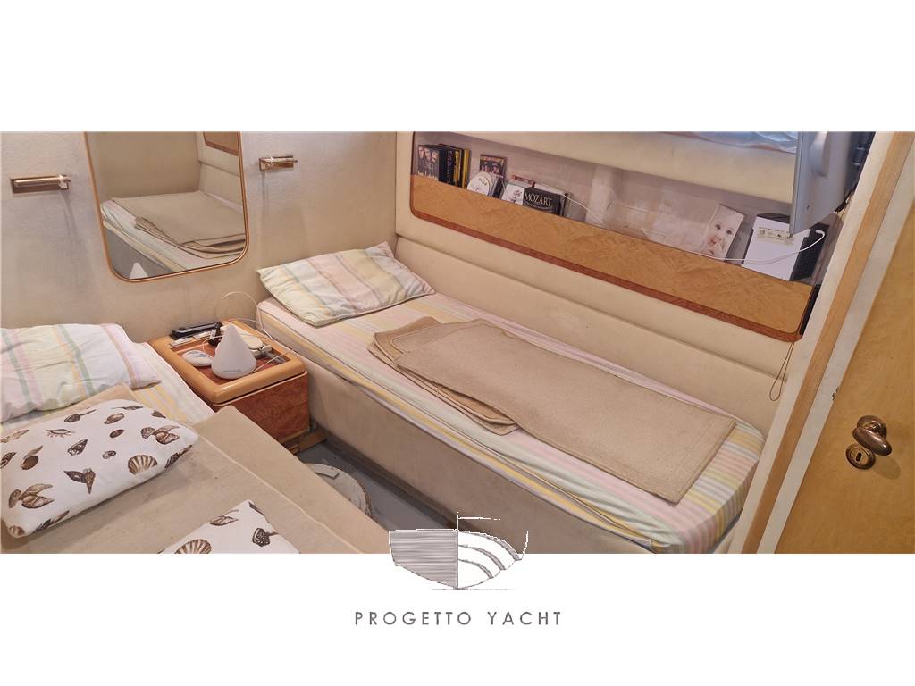Tre cabine con bagno, cabina equipaggio, salone,zona pranzo con tavolo dedicato, cucina chiusa con porta accesso camminamento laterale, pavimenti salone in legno radica di ulivo