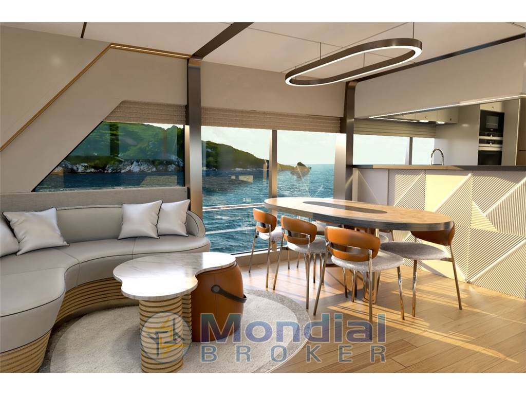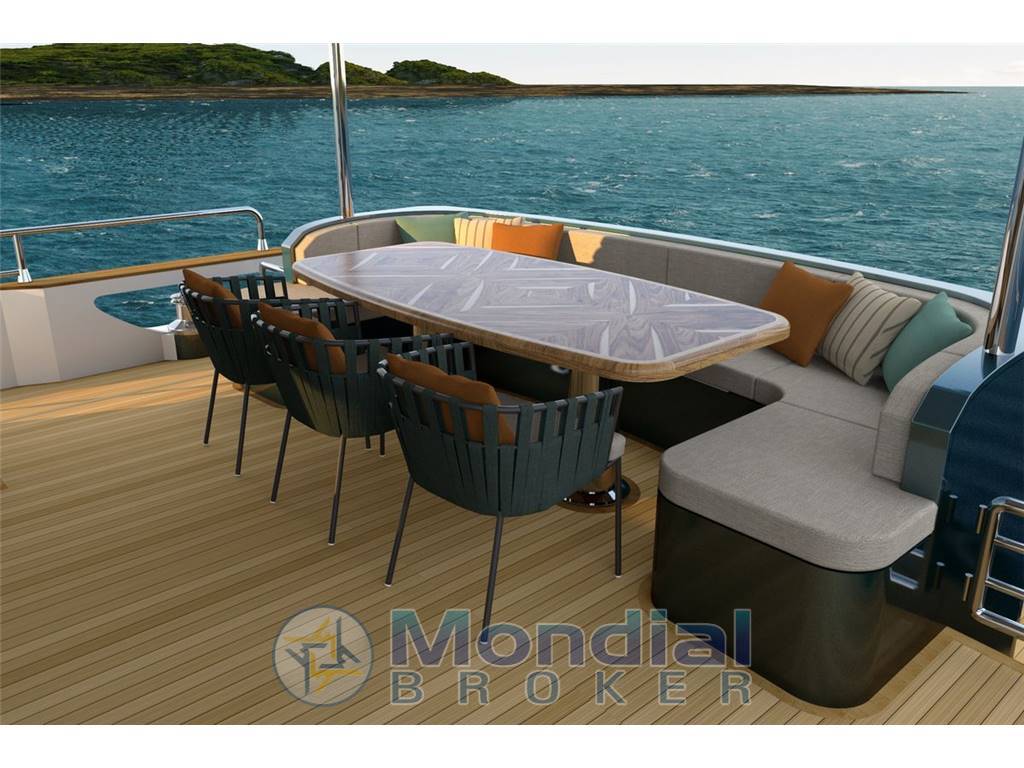 Boasting a range of 2900+ nautical miles and an interior volume of 110 gross tons, the Voyage 90 provides ample space for relaxation and entertainment. Her three spacious decks include a 40-square-meter dining salon with automatic stainless steel sliding doors, a fully equipped galley, and accommodations below deck with three full-beam double cabins with large windows, a semi-beam double cabin, all en-suite. The lower deck includes two crew cabins, which can be increased to three.
