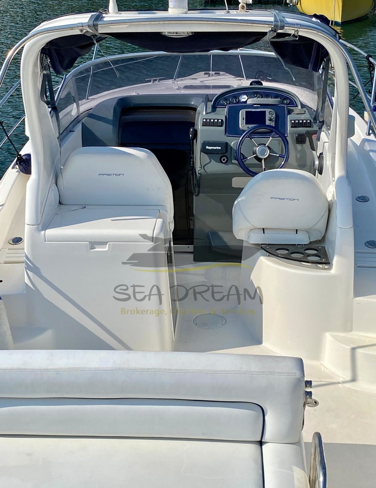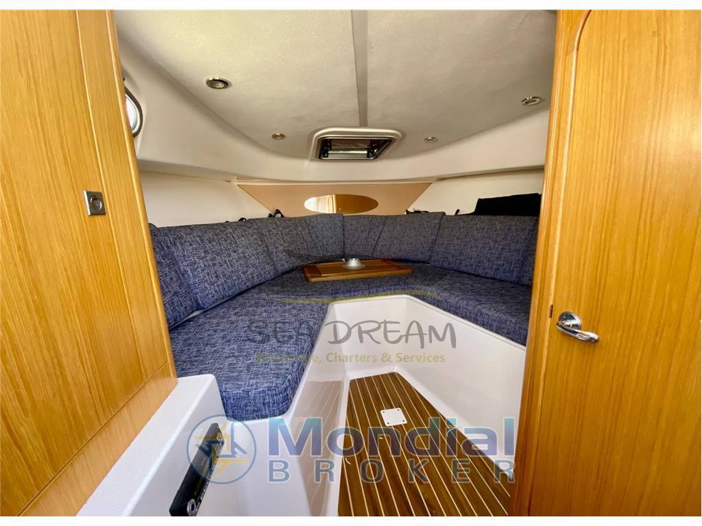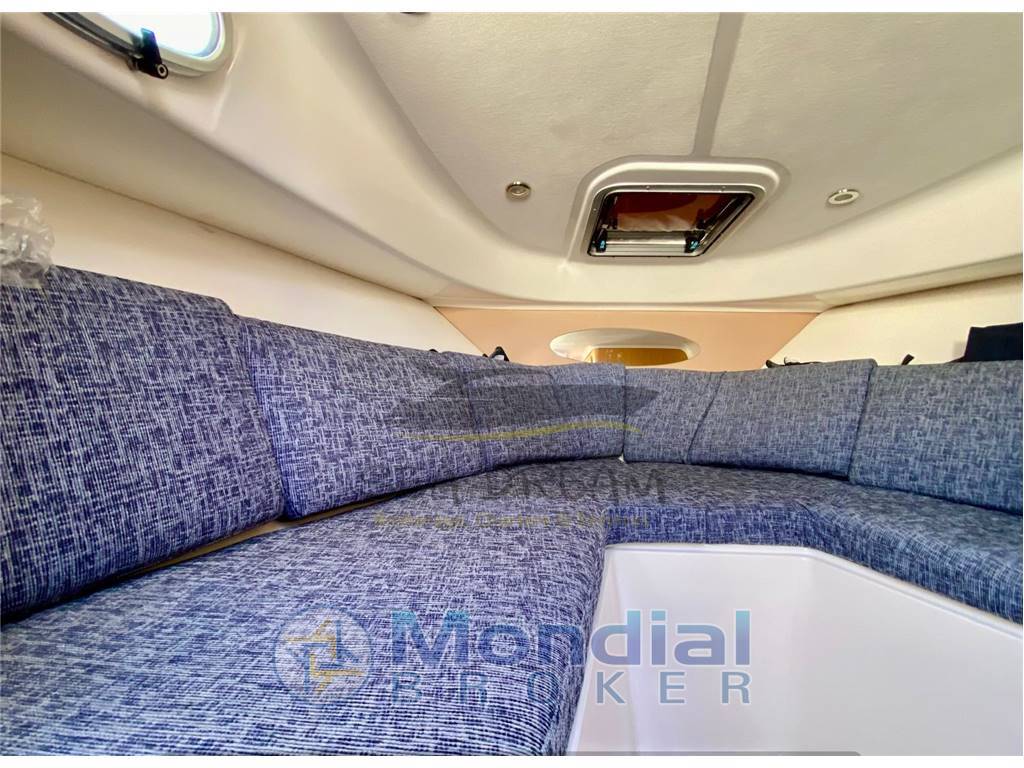 Internamente il Faeton presenta un'ampia cabina open con un lungo divano ad U in tessuto e armadio porta oggetti.