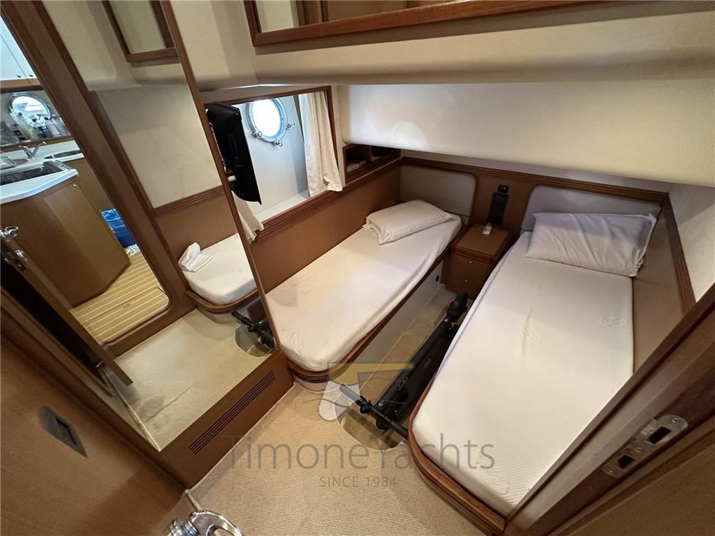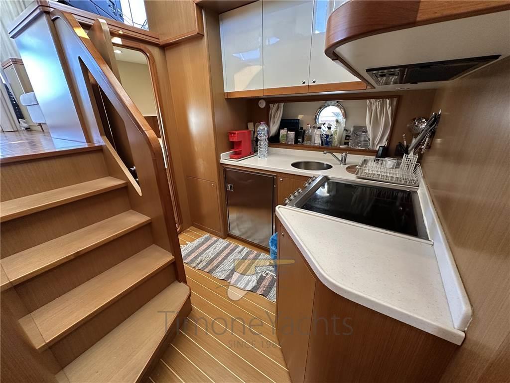 Scendendo sottocoperta, a sinistra, si incontra immediatamente la cucina a forma di L, con frigorifero, piano ad induzione, forno combinato e lavabo a doppia vasca. L’ allestimento della zona notte prevede tre cabine: una armatoriale a prua e due per gli ospiti, con letti singoli, a centro barca. I bagni sono due. Al disotto della piattaforma di poppa si colloca un’altra cabina singola, destinata all’equipaggio.