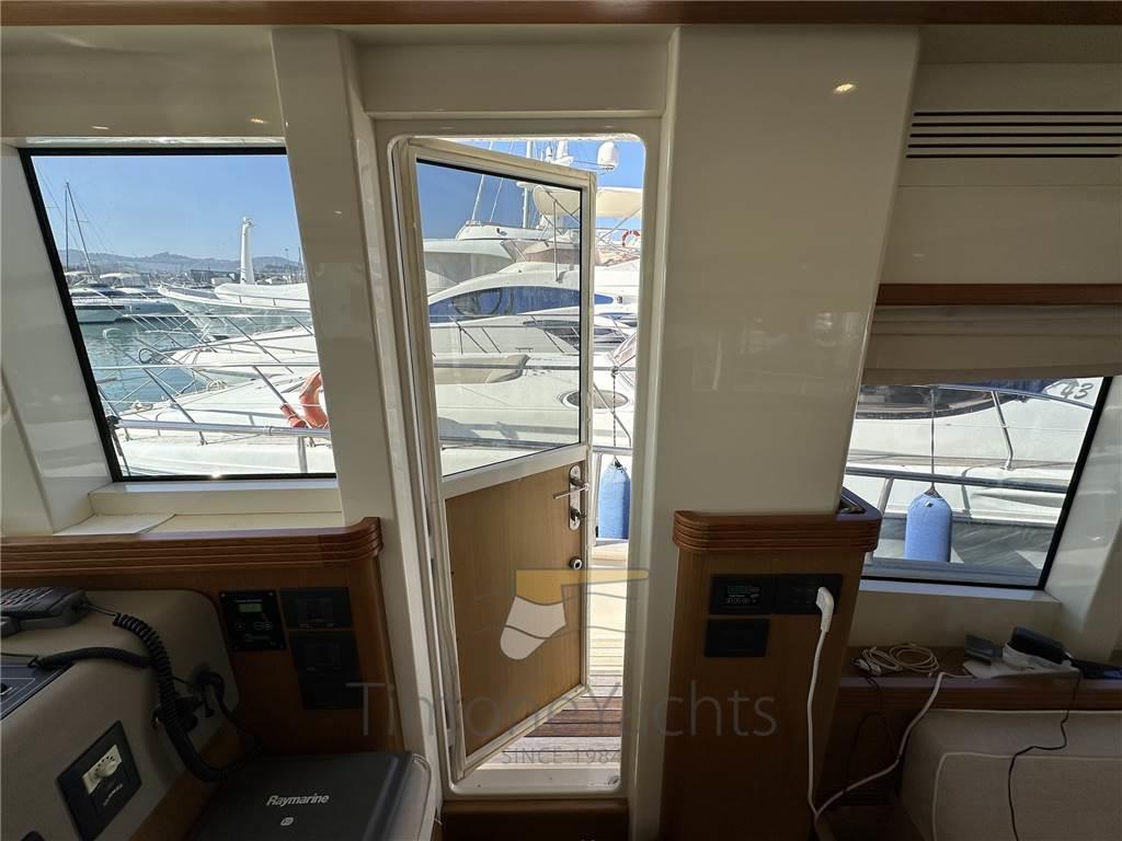 La tuga è fornita di ampie vetrate che si aprono verticalmente ed il ponte principale ospita a prua un comodo prendisole, mentre il flybridge accoglie un secondo prendisole ed un angolo dinette, con divano e tavolo.