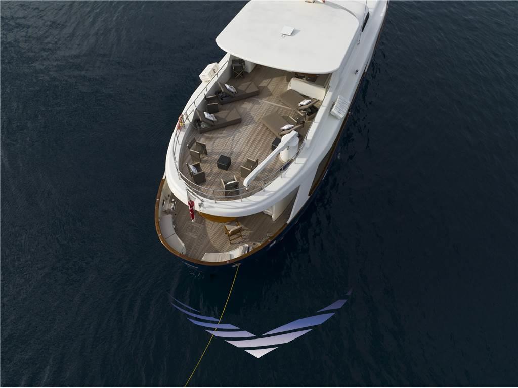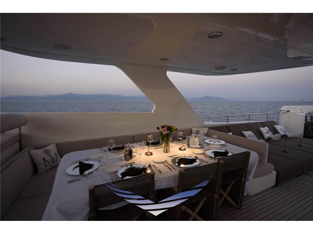 Il suo ampio prendisole, dotato di hard top e di zona pranzo all’aperto, è ideale per rilassarsi tutto il giorno. L’imbarcazione dispone inoltre di una vasca idromassaggio e di un prendisole sul ponte di prua, perfetto per il divertimento di adulti e bambini.