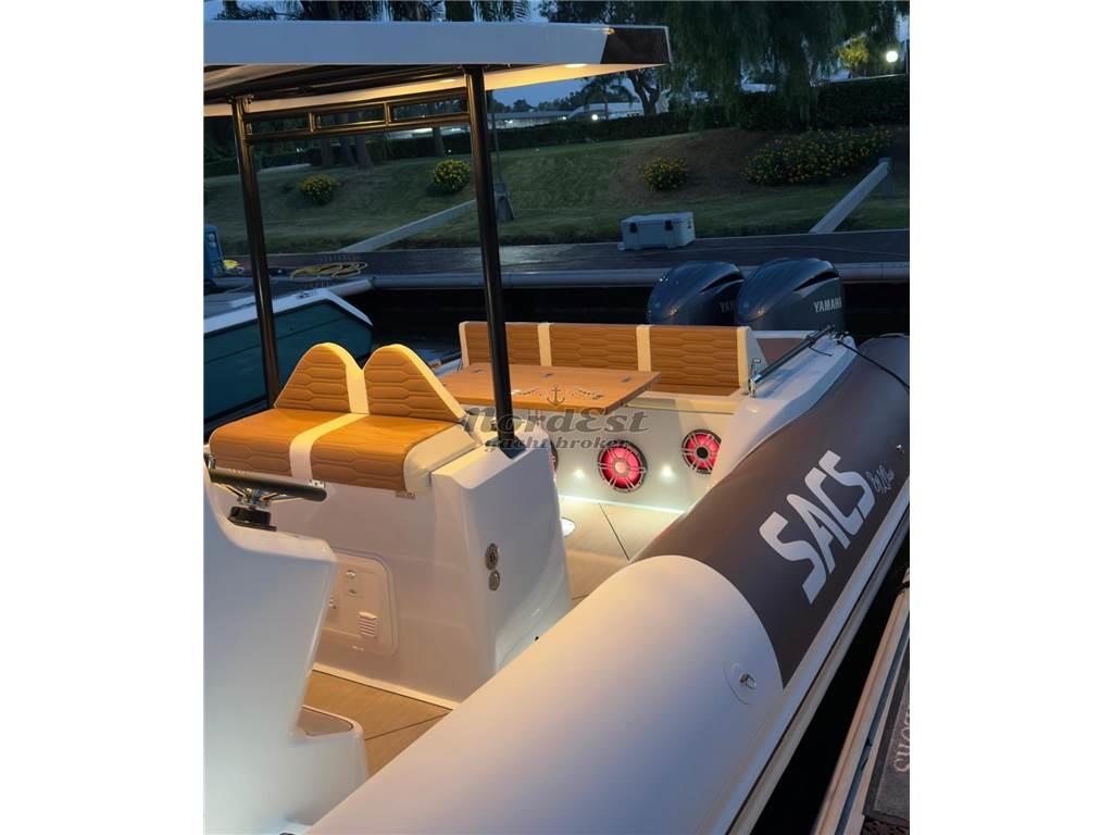 Bellissimo gommone totalmente ideato e realizzato dal nostro cantiere, sono state scelte tonalità di colori e tipi di materiali che mantengono la giusta armonia tra l'eleganza e la sportività naturale di un gommone come questo. Ampio pozzetto con tavolo in teak comodo per 6 persone abattibile, con ampia cucina a 3 fuochi sotto la seduta di guida, doppio frigorifero e seduta a poppa che viene trasformata mediante uno schienale/poggiatesta basculante che in in posizione funge da solo poggiatesta per il prendisole di poppa e nell'altra posizione sia da schienale per la seduta del pozzetto sia da poggiatesta per il prendisole.