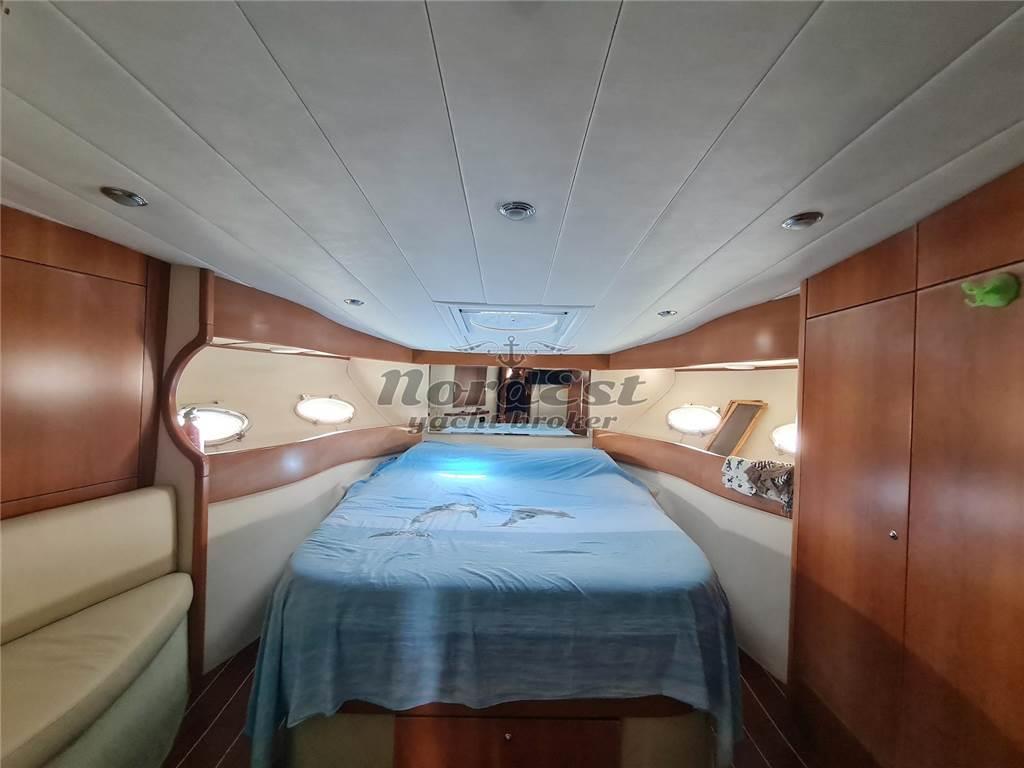A prua vi è la cabina armatoriale, arredata con ampio letto matrimoniale, armadio a tre ante, cassettiera sotto il letto, piccolo armadio a due ante e uno specchio a parete.