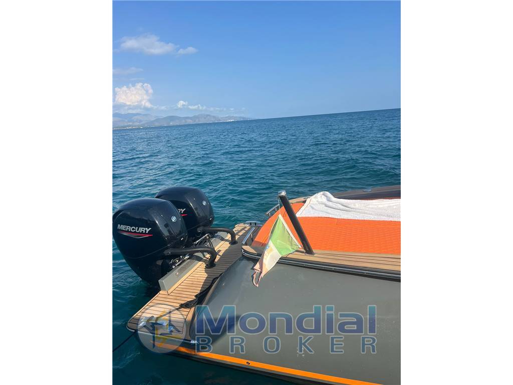 Due motori da 150 cv Mercury con circa 40 ore di moto. Presa da banchina, plotter touch screen Garmin con strumentazione digitale motori, ecoscandaglio e navigatore, conta catena, impianto stereo Fusion, carica cellulare wireless, doccetta a poppa, tutto il calpestio in teak, pali in carbonio con tendalini a poppa e prua, bitte a scomparsa, frigo a carrello, lavandino con piano di appoggio, sei parabordi neri personalizzati, radio vhf, dotazioni di sicurezza per otto persone, battello emergenza soup personalizzato dal cantiere, indicatore manuale serbatoio acqua e benzina.