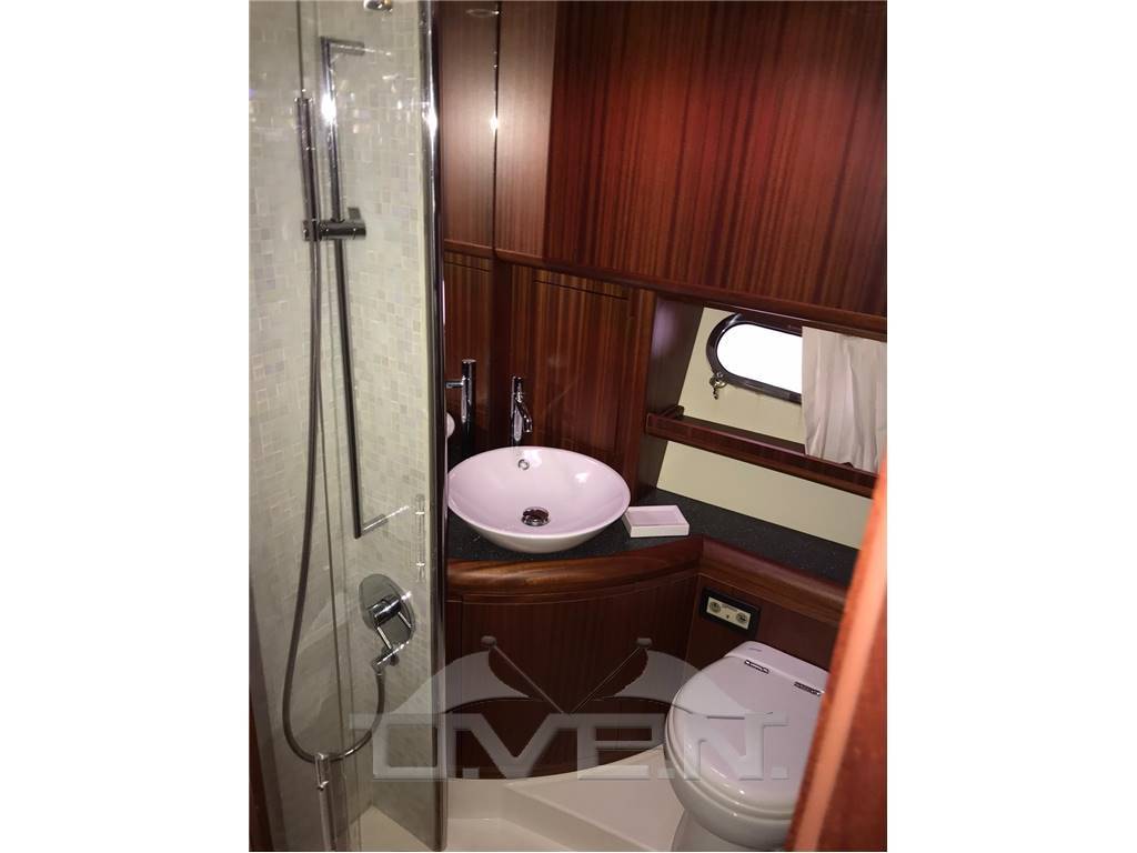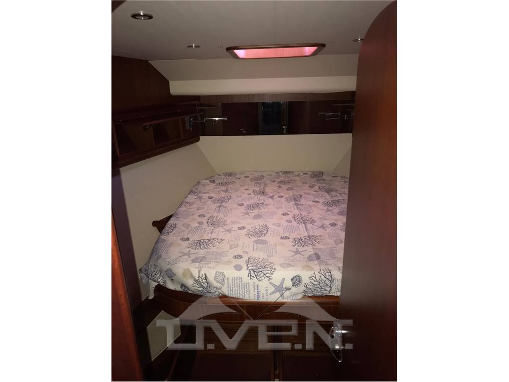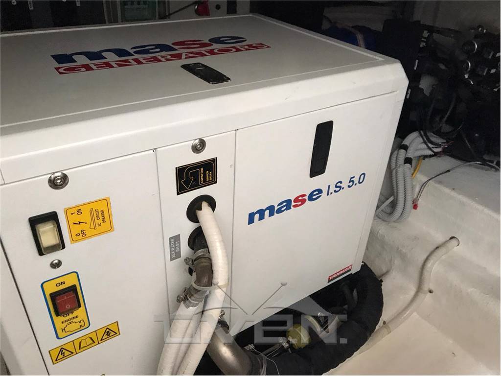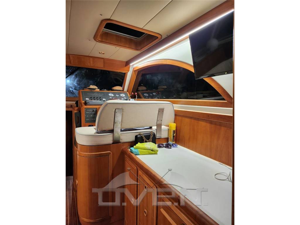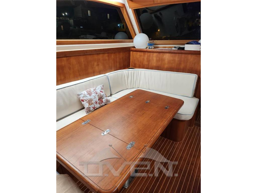 Accessori inclusi: GPS, Trasduttore (velocità, temperatura e profondità), VHF, pilota automatico, Teak nel pozzetto e nei camminamenti laterali, pacchetto luci completo, aria condizionata, flaps elettrici, elica di prua, salpa ancora elettrico, piastra in vetroceramica, cuscineria di prua, passerella idraulica, Tendalino su prendisole di prua, cuscineria interna in pelle, frigorifero in salone, impianto stereo, 3 TV, antenna TV satellitare, Generatore, Serbatoio Acque Grigie