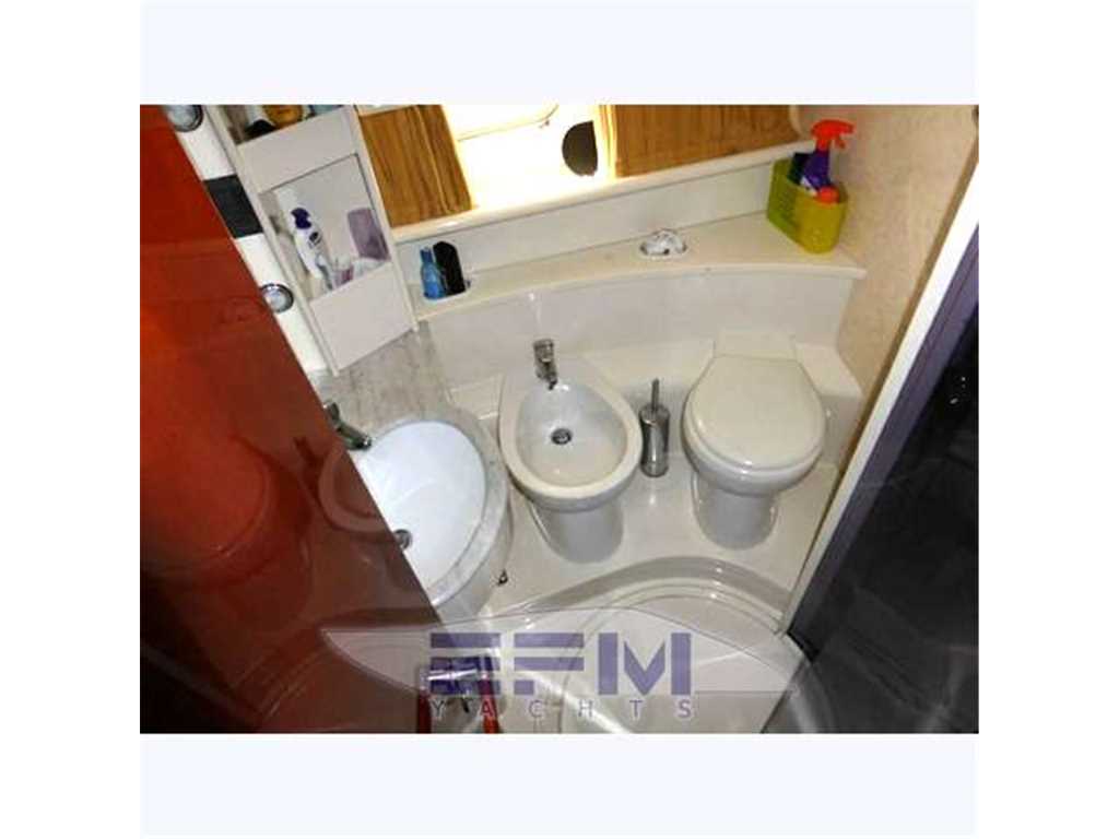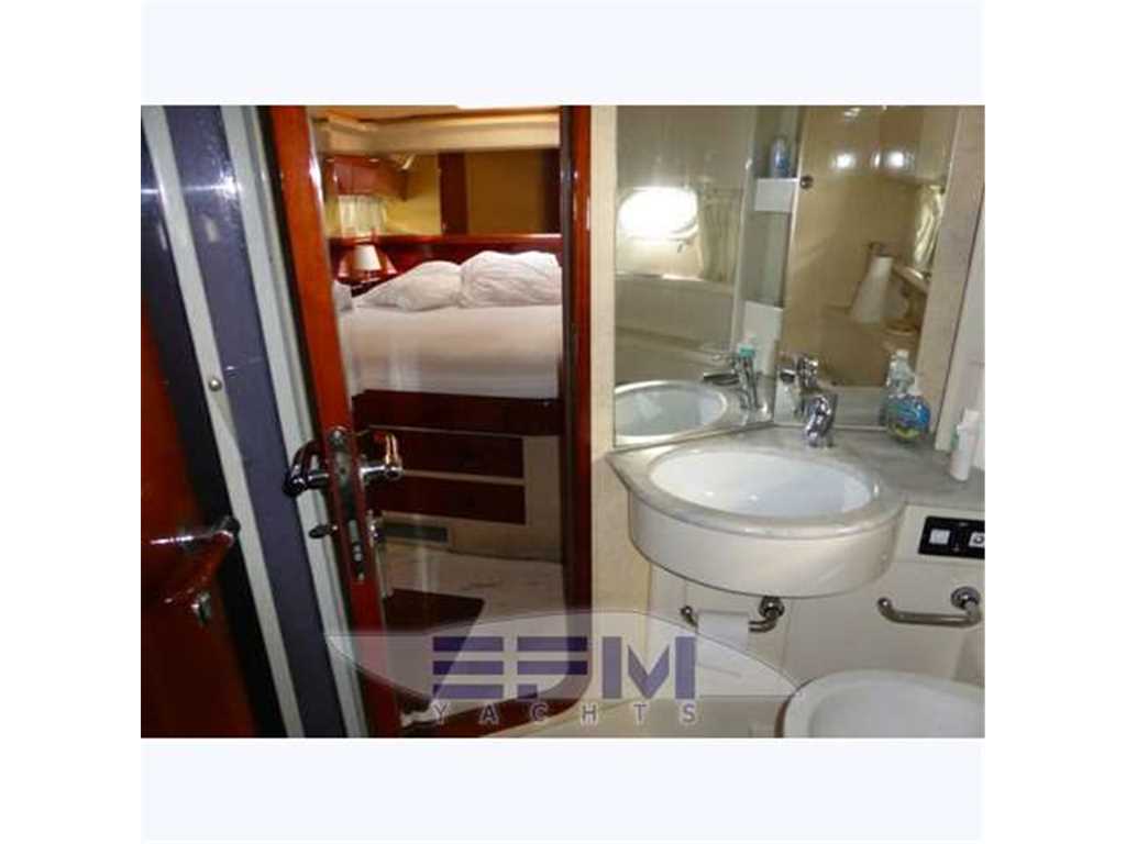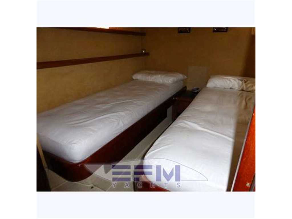 Suddivisione e caratteristiche: zona notte con 3 cabine, armatore a prua con matrimoniale e servizi privati, due cabine ospiti gemelle con due letti affiancati ognuna, locale servizio ospiti a doppio accesso. Salone con doppia dinette e doppio tavolo, frigobar da 75 litri, chiusura pozzetto con porta scorrevole e un'anta basculante, 2 poltrone a sinistra, radiostereo Hi-Fi con altoparlanti in salone e sul flying bridge. Discesa cucina a sinistra con accesso alla cabina equipaggio con letto e locale servizi