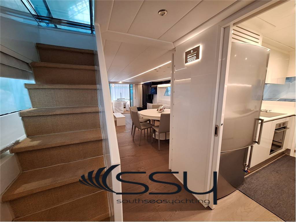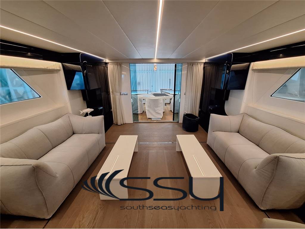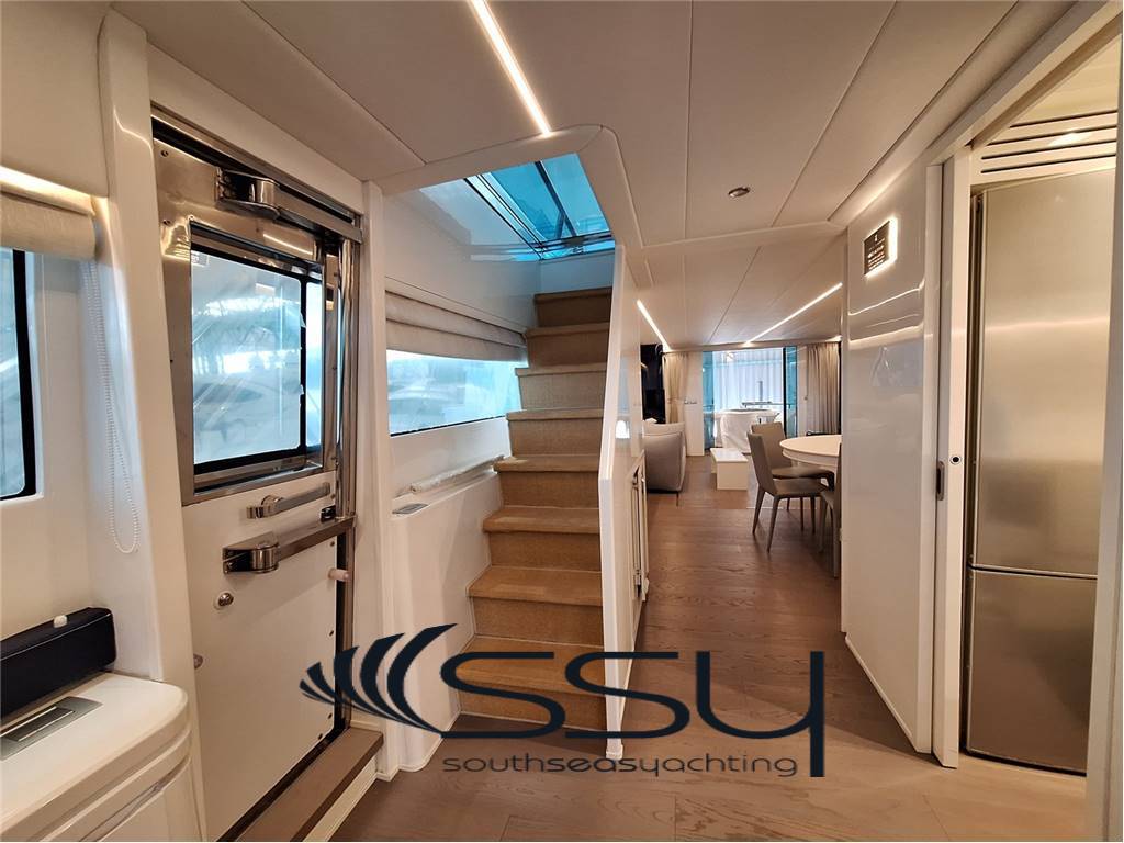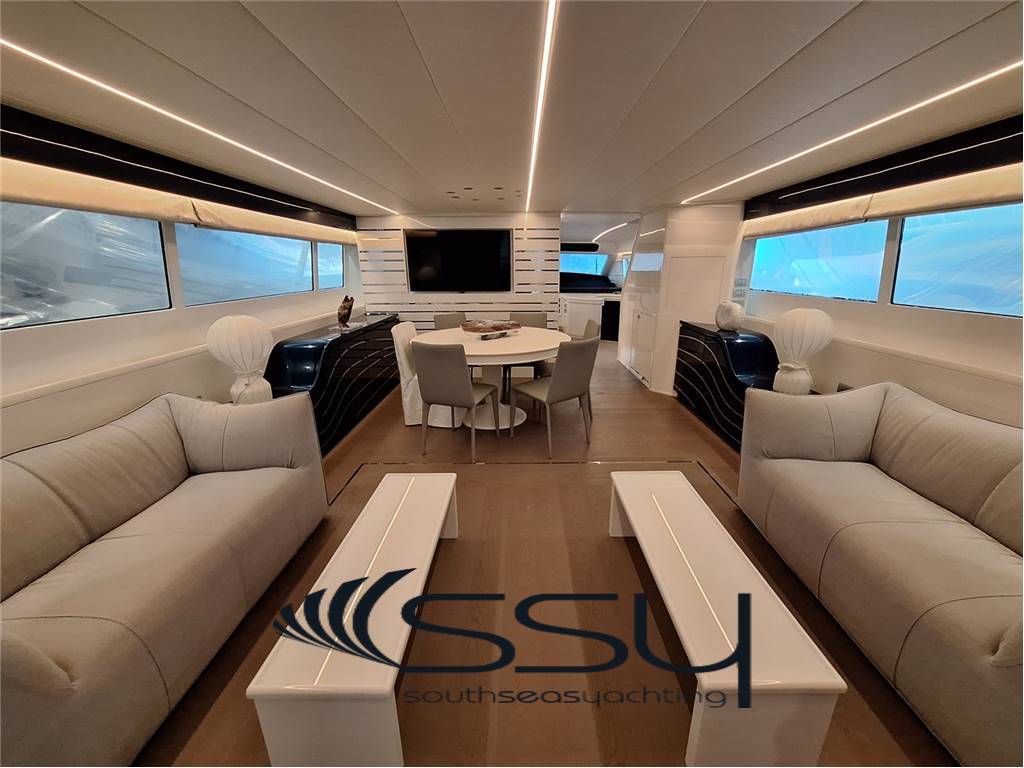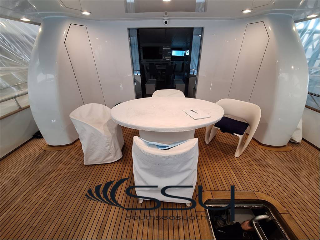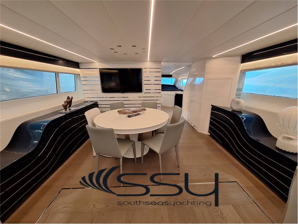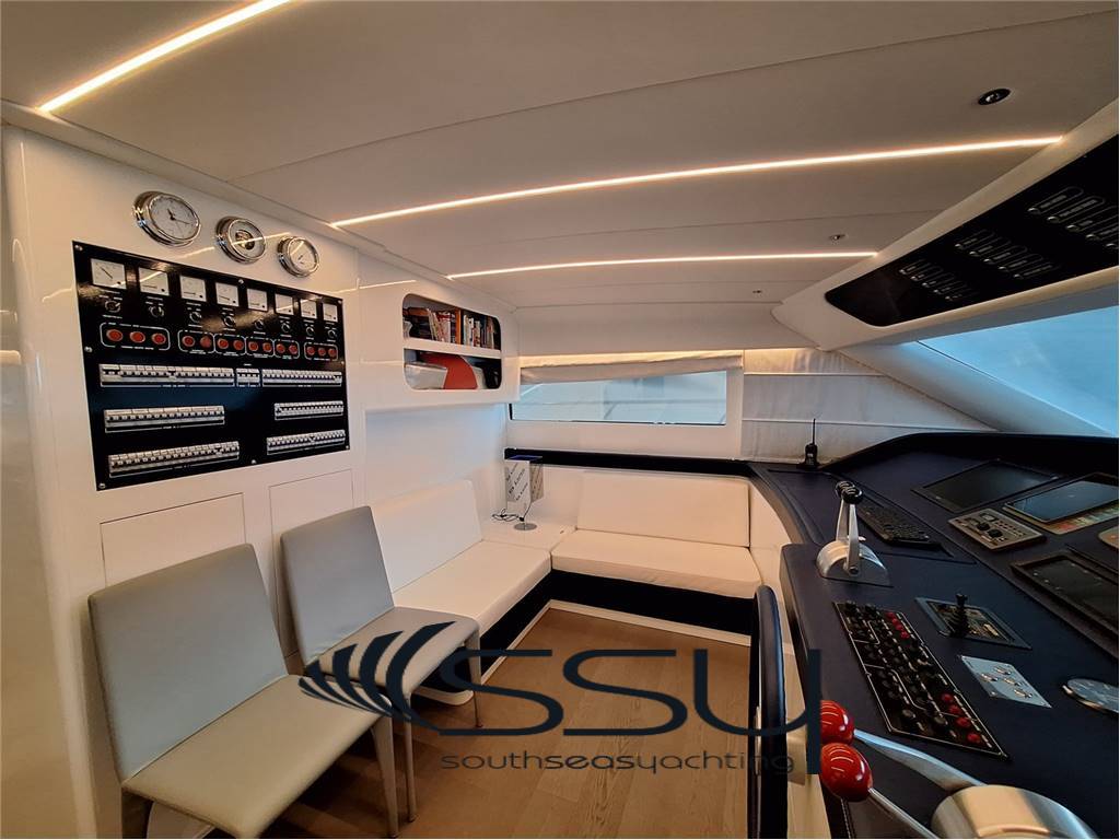 - Plancia comandi verso prua con dinette composta da due divanetti ad angolo e tavolo, seconda porta laterale di servizio ed accesso diretto al flybridge;