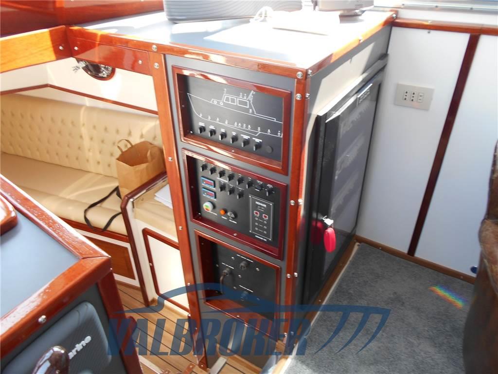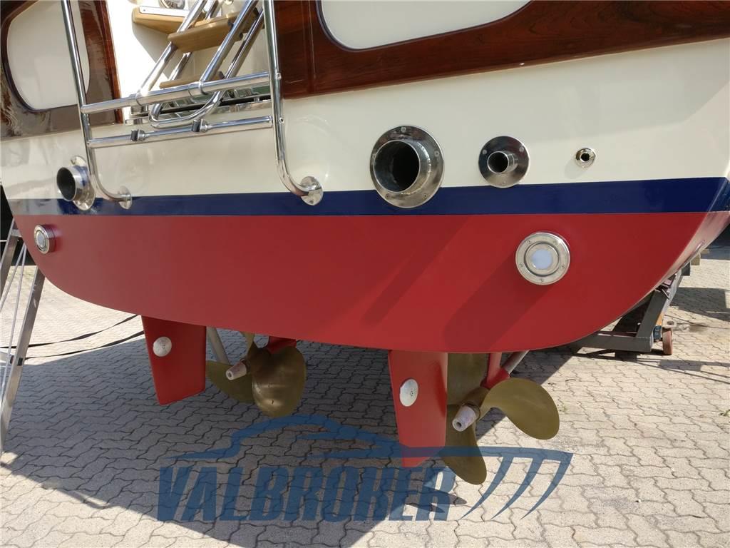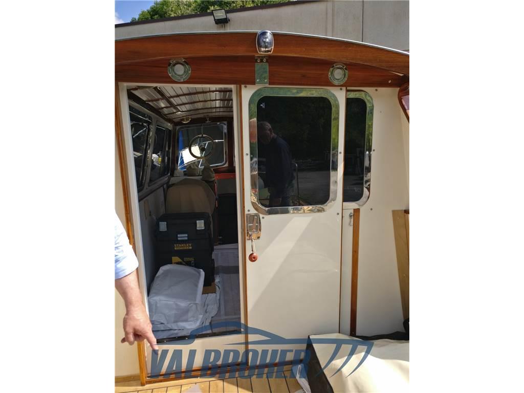 Lo scafo inglese costruito nell’Hampshire in plastica rinforzata con fibra di vetro nel 1975 di incredibile robustezza contiene all’interno tre serbatoi di gasolio che consentono una lunga autonomia di navigazione. È stato completamente ristrutturato dal 2011 al 2014: i motori Aifo sono stati revisionati e riverniciati . Lo scafo è stato riverniciato, nuovo ponte di Teak, tutti i profili in legno di mogano. L’impianto elettrico rifatto con le canaline in acciaio inox, nuova strumentazione RAYMARINE. Il locale motori insonorizzato, le nuove pompe di sentina, tutti i filtri gasolio ed acqua con tutte le nuove tubazioni, le linee d’asse rifatte. In coperta sono stati rifatti su misura in acciaio inox i tientibene mancanti sulla tuga e tutto il grande pulpito di prora, anche a poppa il nuovo passo uomo per accedere al locale timoni. Sono stati inoltre cromati tutti gli oblò ed in plancia sostituiti i vetri davanti includendo i nuovi chiarovisori per navigare anche con onda formata.