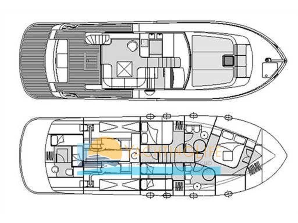 1 Matrimoniale italiana, 1 Matrimoniale francese, 1 Doppia in piano, 1 Cabina equipaggio, 1 Toilette con doccia, 1 Dinette, 1 Cucina, 1 Toilette Equipaggio, 2 Toilette doccia no bidet