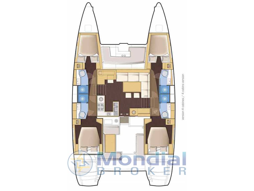 4 cabine matrimoniali con bagni privati completi di doccia separata, lavello e wc elettrico con pavimentazione in teak. La zona pranzo sulla sinistra dell'ingresso è dotata di una cucina con fuochi a gas, microonde e forno a gas, frigorifero, congelatore e lavello acqua dolce e salata. Dinette con ampio tavolo e divano a C in pelle, trasformabile in letto matrimoniale.