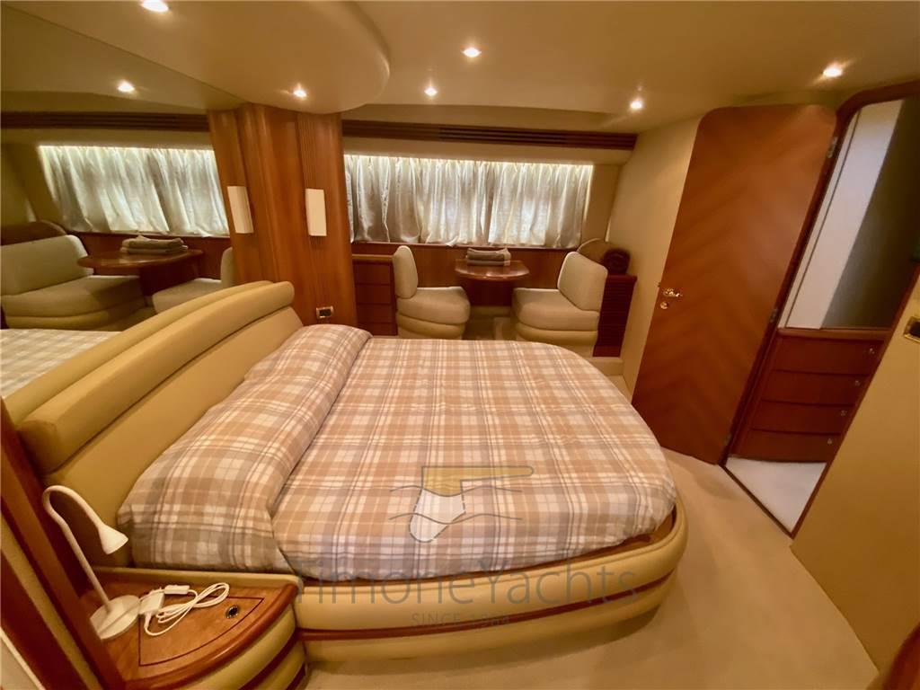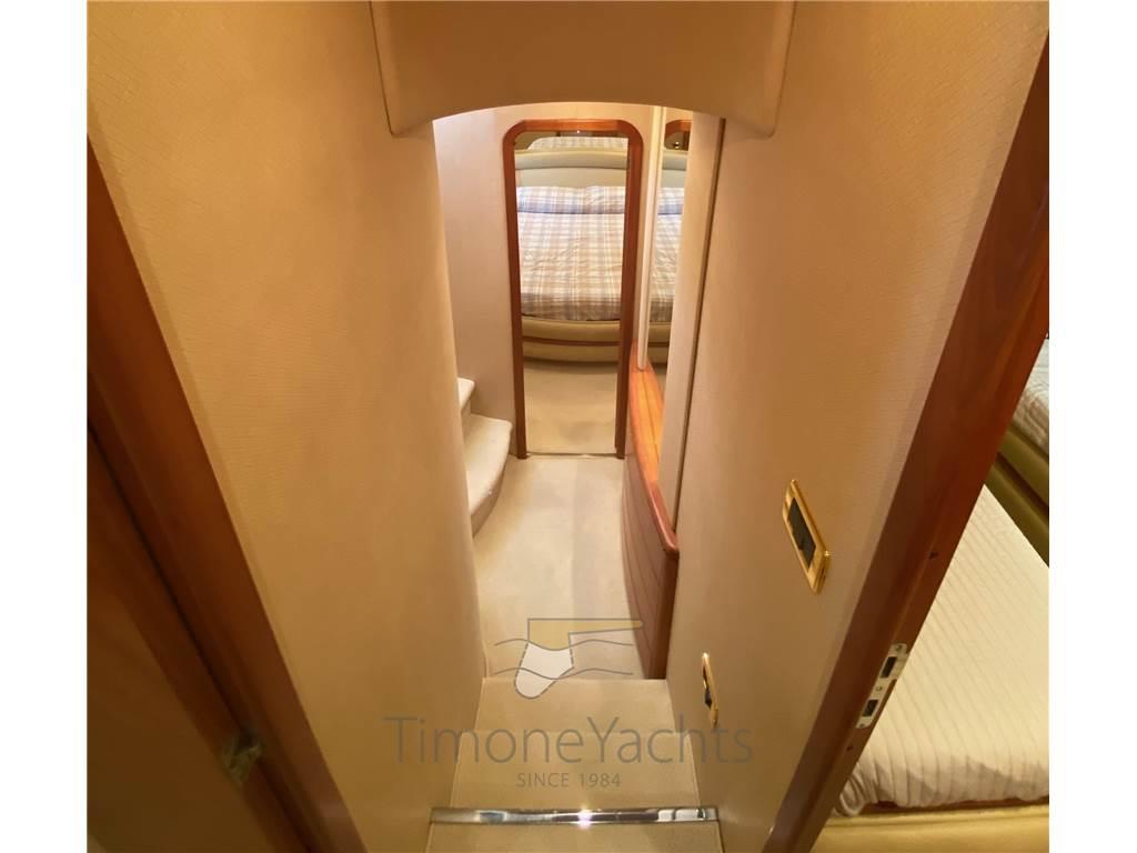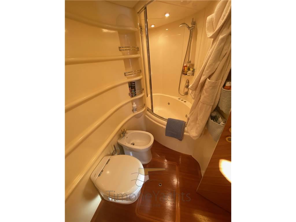 Grande salone con cucina (semi)separata. 4cabine ospiti al ponte inferiore. Master a tutto baglio con bagno e bidet. Vip a prua con bagno. Ospiti con letti gemelli in murata di Sx, sempre con bagno. Ospiti con letti incrociati a Dx e quarto bagno, accessibile anche da corridoio e quindi fruibile come daily toilet.