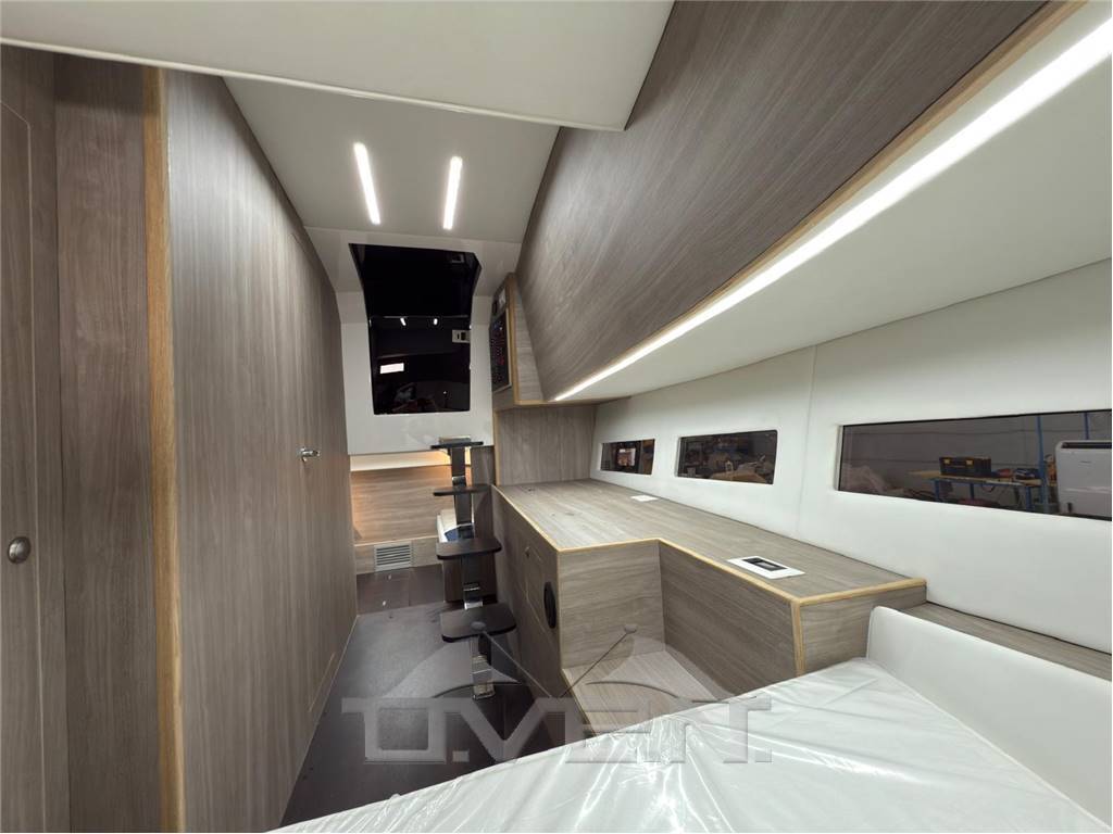 Porta accesso cabina a scomparsa - divano convertibile - cucina (su richiesta) - gavoni alloggio materiale - piano calpestio in legno pregiato