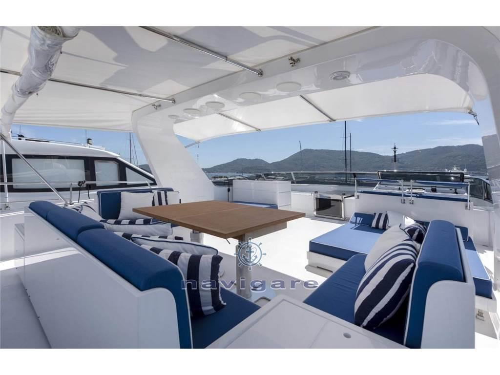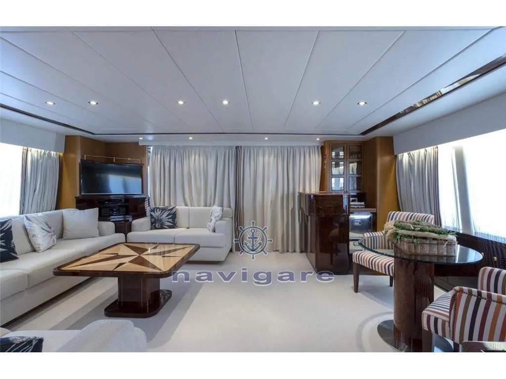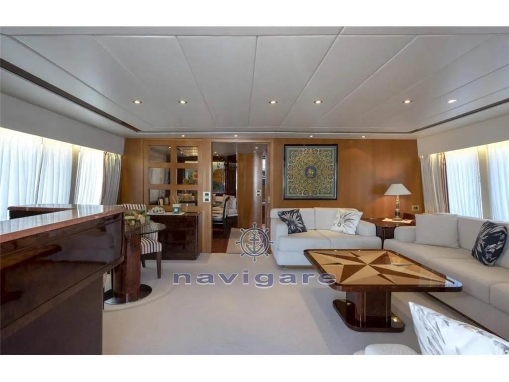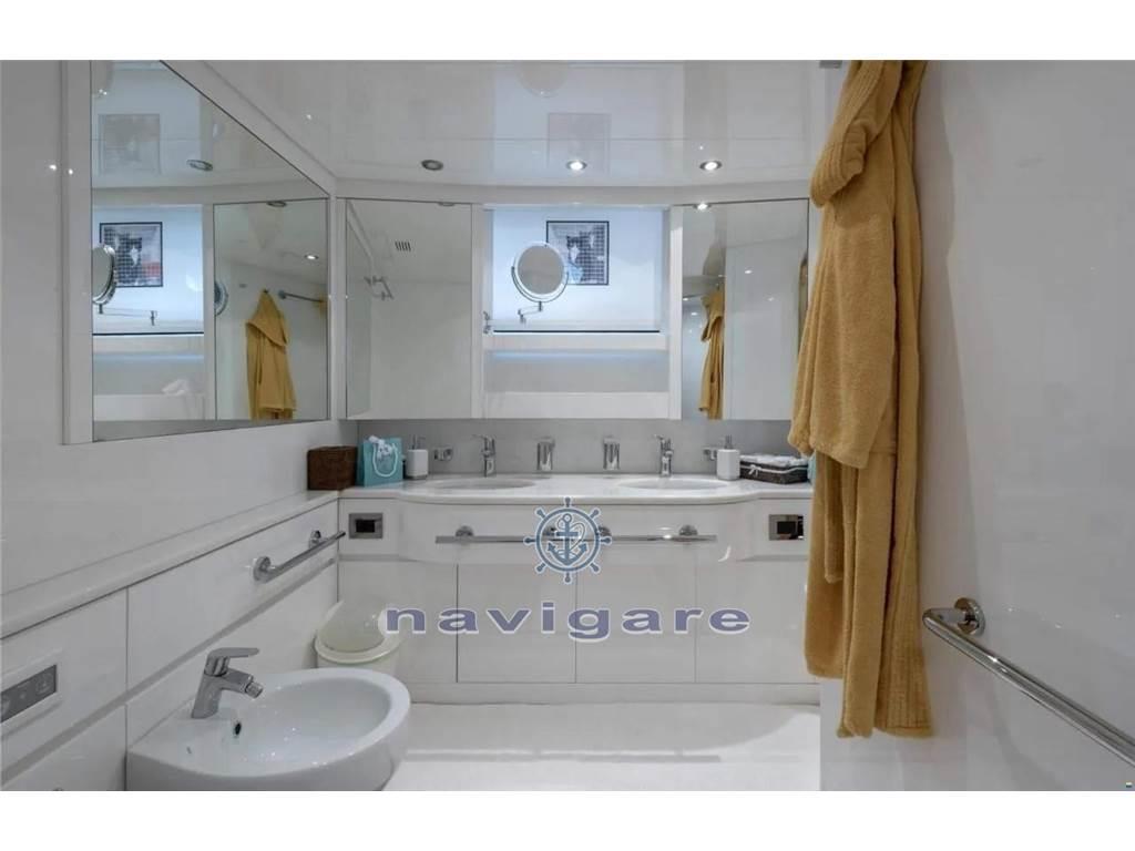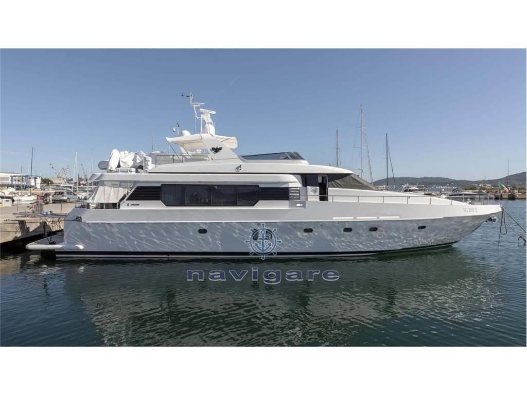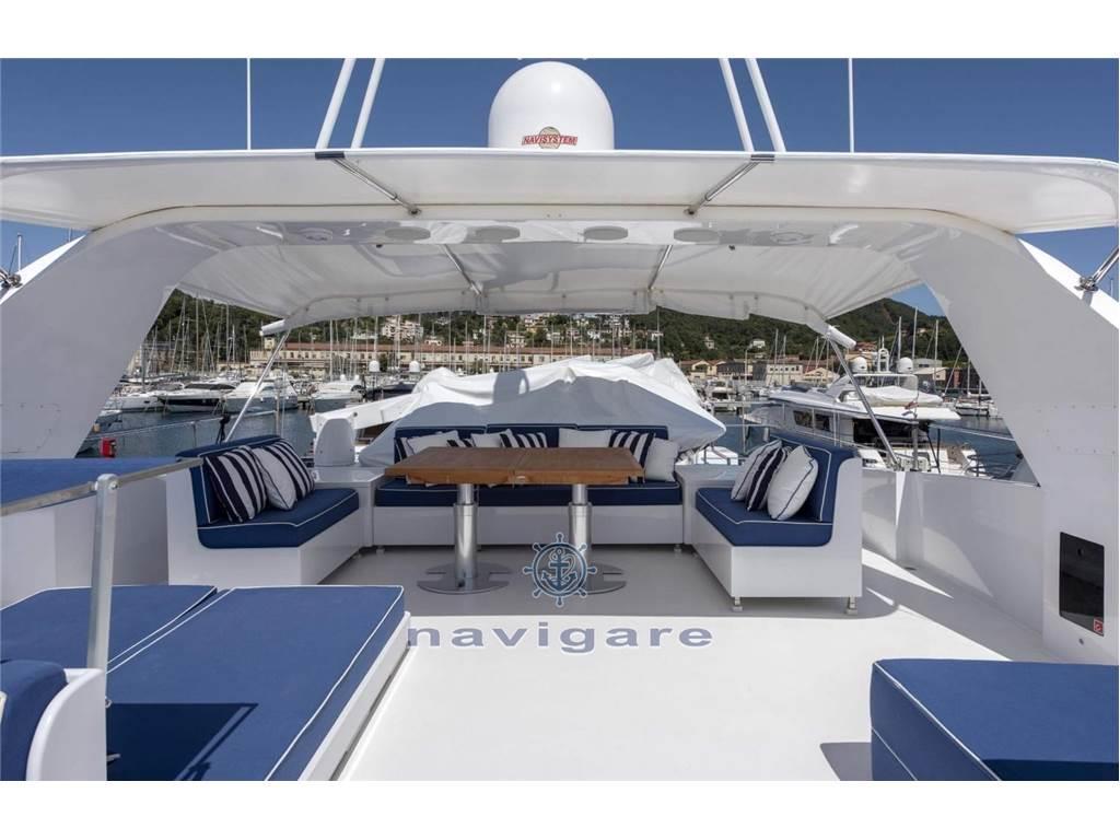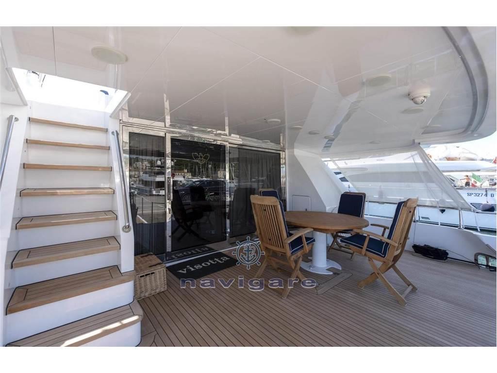 Allarme fumo/gas, Allarme motore, Ancora, Autogonfiabile, Batterie, Bussola, Caricabatterie, Contamiglia, Doccia esterna, Doppia timoneria, Ecoscandaglio (Furuno), Elica di prua - bow thruster, Flap idraulici (N°2), GPS (Furuno), Gruette per tender su fly, Luci di cortesia, Passerella (IDRAULICA), Piattaforma, Pilota automatico (Furuno), Plotter, Pompa di sentina automatica, Pompa di sentina manuale, Porta ingresso, Porta laterale, Pozzetto Teak, Presa 220V banchina, Presa acqua banchina, Radar, Raddrizzatore, Radio VHF (Furuno), Rollbar, Salpa Ancore Elettrico, Scaletta da bagno, Stabilizzatori (Gyroscopic stabilizer SEAKEEPER mod. 26), Tromba, Winch tonneggio di poppa, Winch tonneggio di prua