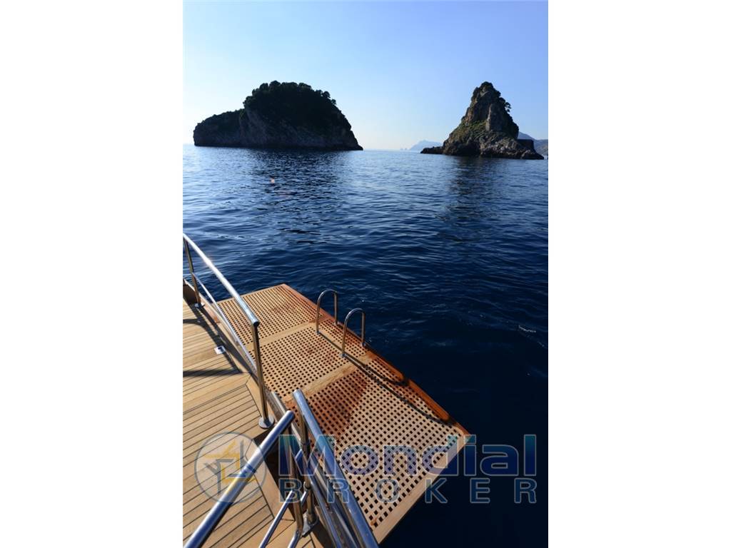 Zona poppiera da 7 metri quadrati con alloggiamento a scomparsa della passerella idraulica per consentire l’imbarco e lo sbarco degli ospiti, dell’autogonfiabile ad espulsione rapida, di un vano deposito attrezzature, dotata di una robusta battagliola di protezione con 2 cancelletti per lo sbarco e l’imbarco degli ospiti e per l’accesso alla plancia da bagno;