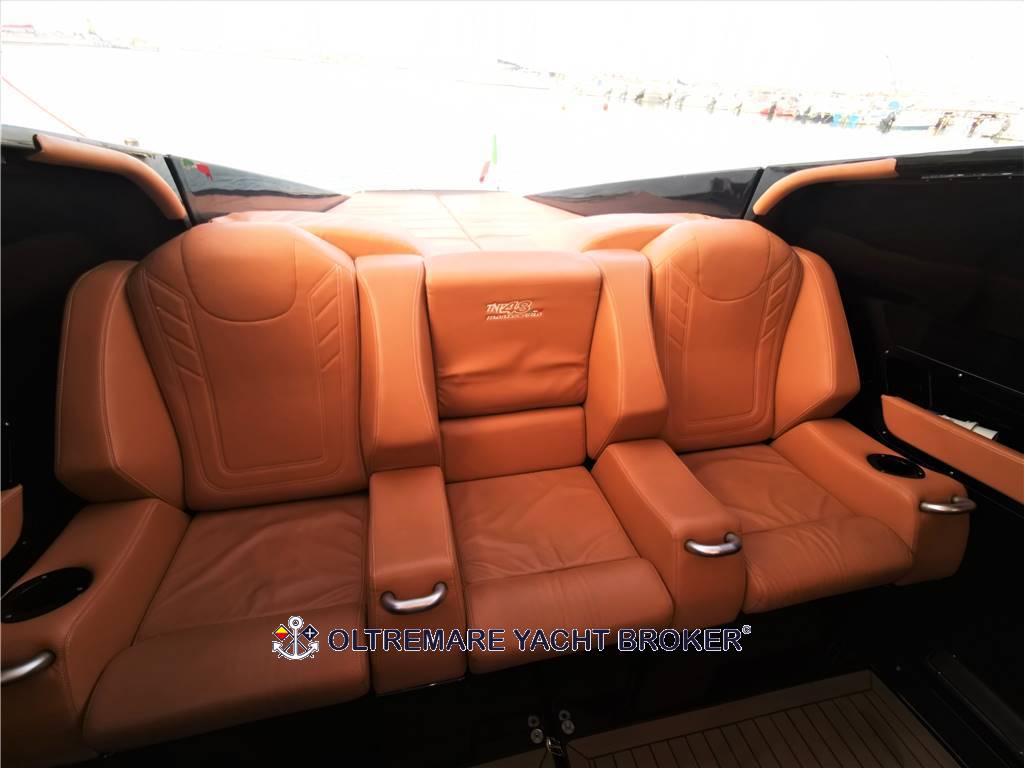 Speciali sedili mettono gli ospiti a proprio agio per far loro provare l’ebbrezza di volare a 85 nodi (autolimitati) sull’acqua, una prestazione paragonabile a quella di un’auto da corsa lanciata a oltre 300 Km/h. In rada o in banchina si coglie il piacere di un drink nel pozzetto o seduti sui divani sottocoperta, ci si abbronza sui materassini prendisole a poppa o sul ponte di prua, mentre per scendere in acqua o risalire a bordo si utilizzano le pedane e le scale disegnate sulla lunga coda. Il design sportivo è addolcito da sinuose curve che plasmano il ponte e i passavanti. Il parabrezza protegge l’equipaggio avvolgendolo come in un abbraccio. In cabina si apprezza il piacere del lusso e di una comoda cuccetta per la notte. L’opera viva è dotata di due redan e di innovative prese d’aria collegate al piano di coperta e derivate dal modello da competizione che consentono la iperventilazione dello scafo per raggiungere prestazioni imbattibili.