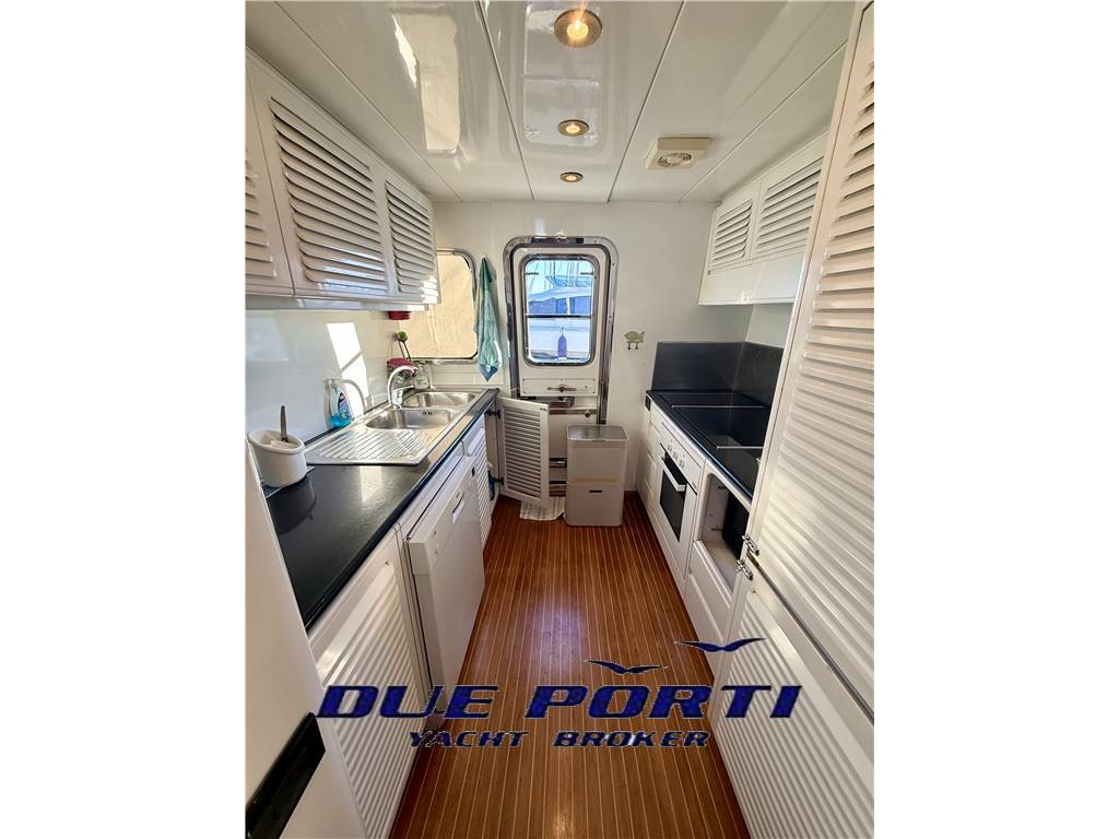 Cucina separata sul main deck con porta laterale equipaggiata con frigo/freezer a colonna, lavello, lavastoviglie, forno, microonde e piastra a induzione.