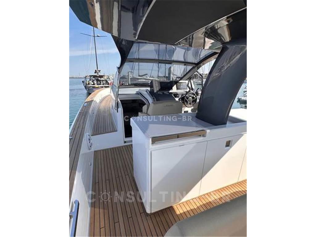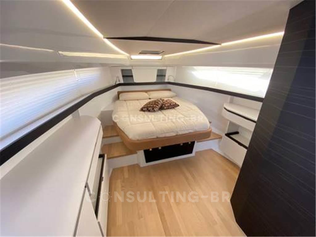 Luci di navigazione Coperta e tecnologia Ancora Ultramarine Verricello elettrico Piattaforma di poppa idraulica con scaletta da bagno integrata Terrazze laterali idrauliche Teak sui ponti laterali, sul pozzetto e sulla piattaforma Trim ZipWakeSistema Bugstrahlruder CockpitDoccia 220V Allacciamento a terra + caricabatteria Illuminazione subacquea (2x) Tavolo pozzetto regolabile elettricamente in altezza Pattini di poppa laterali ribaltabili Interni e comfort Climatizzatore 20.000 BTU (riscaldamento/raffreddamento)