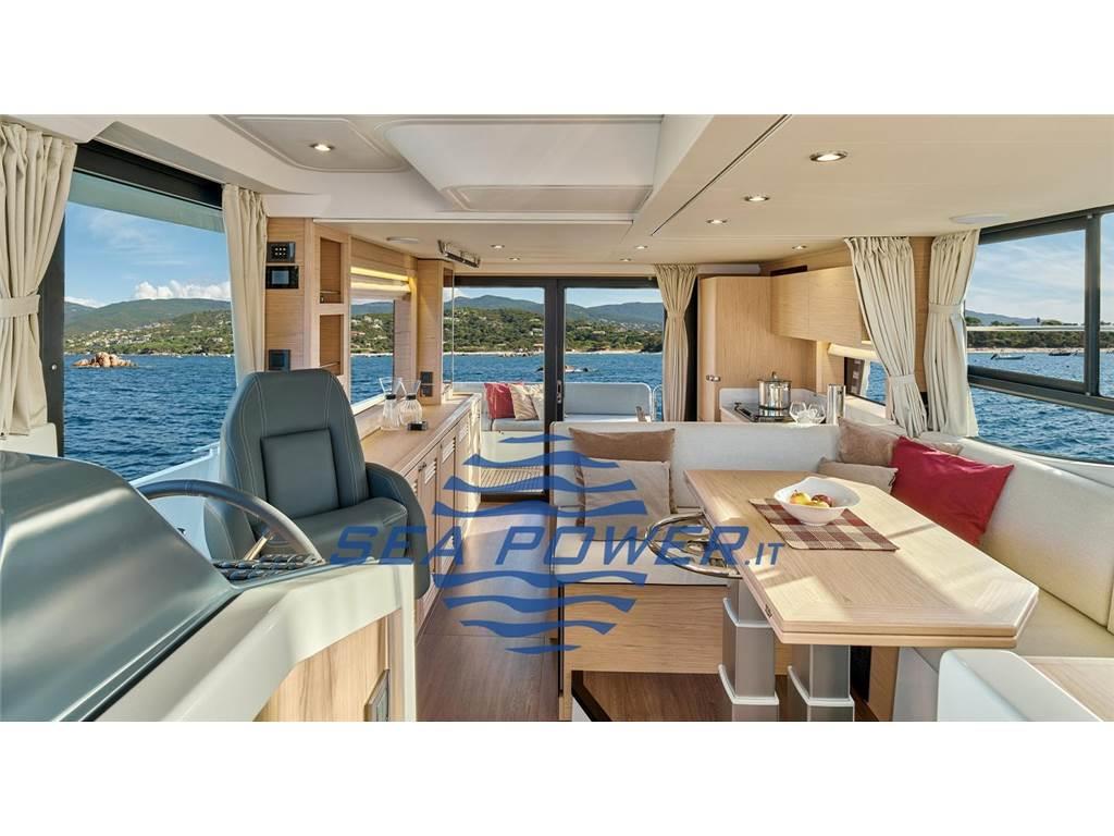 Il flybridge da 20 m² offre un piacevole spazio abitativo panoramico. La postazione di guida e il suo sedile centrale sono circondati da 2 divanetti che consentono a tutto l'equipaggio di stare assieme.
