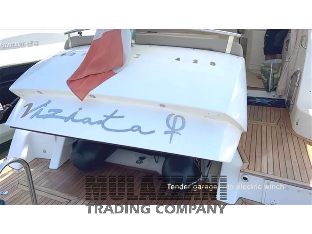 Allarme motore, Ancora, Angolo barra, Autoclave, Autogonfiabile, 8 Batterie, Bussola, Caricabatterie, Comando motori elettronico, Contamiglia, Display, Doccia esterna, Ecoscandaglio (Garmin), Flap idraulici, Garage per tender, GPS (Garmin), Hard top, Indicatori Flaps, Lavandino nel Pozzetto, Luci di cortesia, Luci subacquee, Passerella (a scomparsa Besenzoni), Piattaforma (in teack), Pilota automatico, Plotter (Garmin), Plotter con antenna GPS, Pompa di sentina automatica, Pompa di sentina manuale, Porta ingresso, Pozzetto Teak, Presa 220V banchina, Presa acqua banchina, Radar (Garmin HD), Raddrizzatore, Radio VHF (Garmin), Salpa Ancore Elettrico, Scaletta da bagno, Tavolo pozzetto, Tavolo Salone Abbattibile, Tender, Tromba