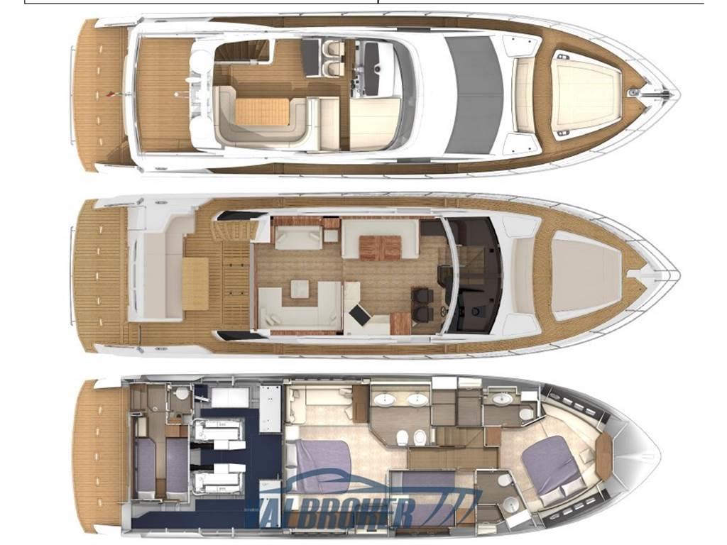 Yacht di lusso con tre zone prendisole dedicate: una a prua, con lettino prendisole e poltrone reclinabili e due sul flybridge, che offrono uno splendido balcone con vista sul mare. Tre cabine doppie con servizi e cabina marinaio con servizi.