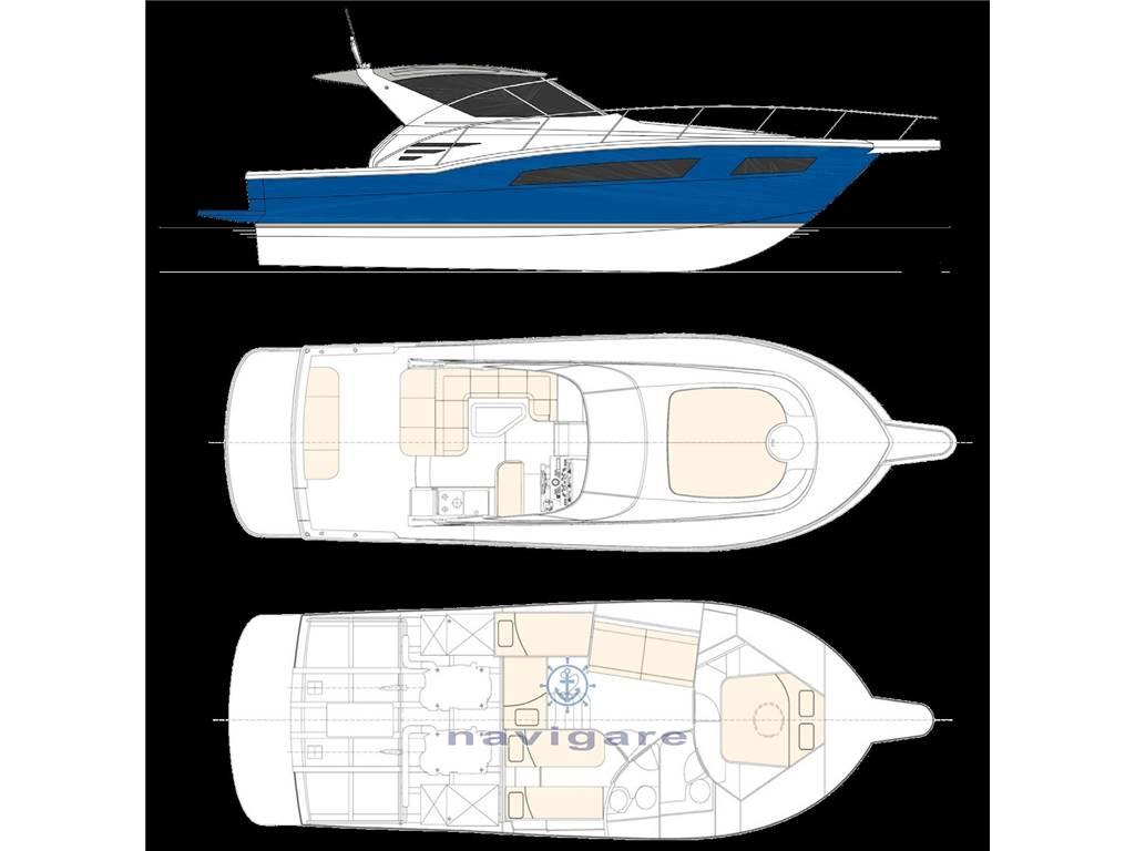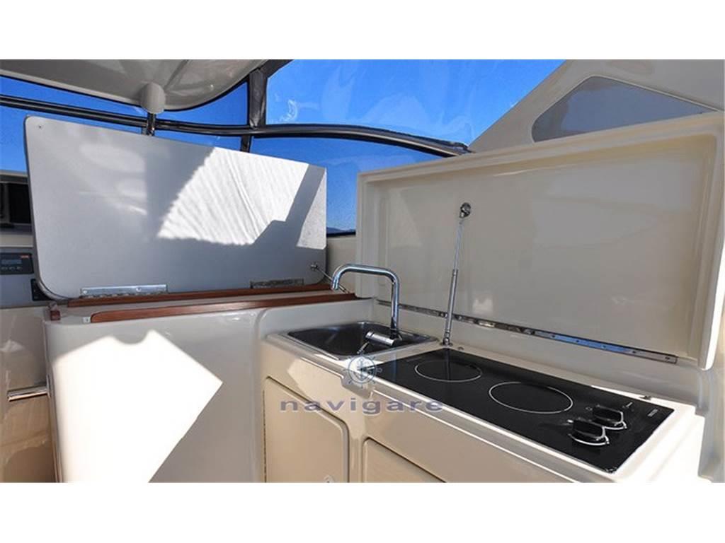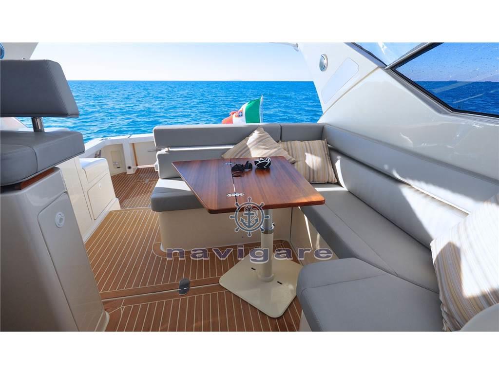 BBQ/ Grill (ESTERNO), Boiler, Cucina, Cuscineria completa, Cuscineria di poppa, Cuscineria di prua, Fornello, Frigorifero esterno (40 L), Impianto TV, Prese interne 12v, Prese interne 220v, Radio AM/FM, Stereo, Tendalino, TV, 2 WC marino elettrico, Il bordo libero prodiero, insieme alle ampie sezioni della porzione anteriore, rendono la barca asciutta, anche quando il vento comincia a gonfiare le onde, e aggiungono spazio vivibile all’interno e all’esterno. Un enorme potenziale in termini di comodità e fruibilità garantito anche dal pozzetto di 6,80 metri quadrati, che puoi completare con un divano trasformabile in prendisole per favorire la tintarella dei tuoi ospiti. Un cruiser perfetto per tutta la famiglia.