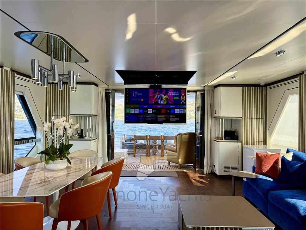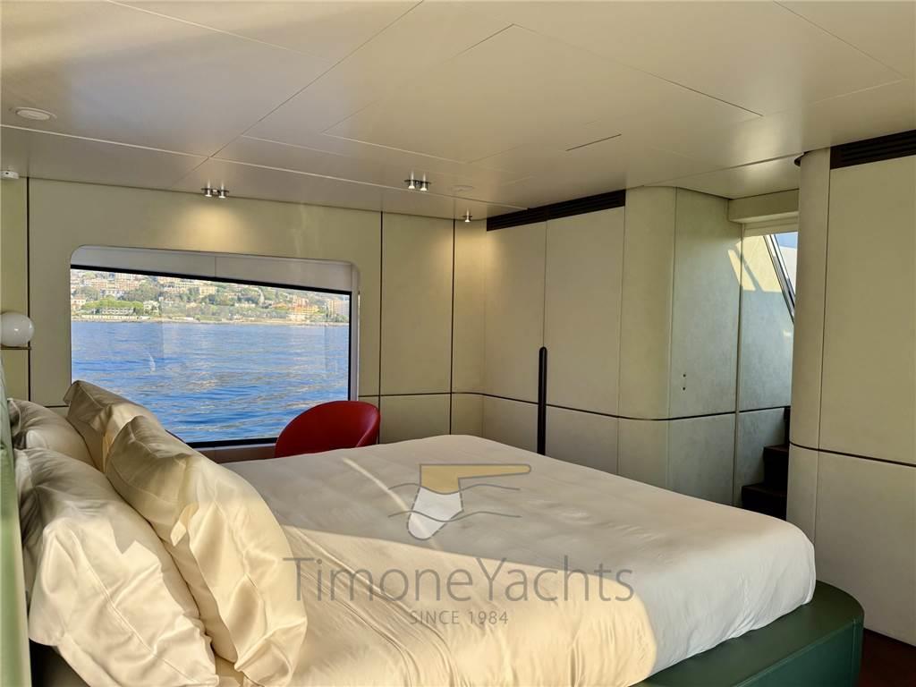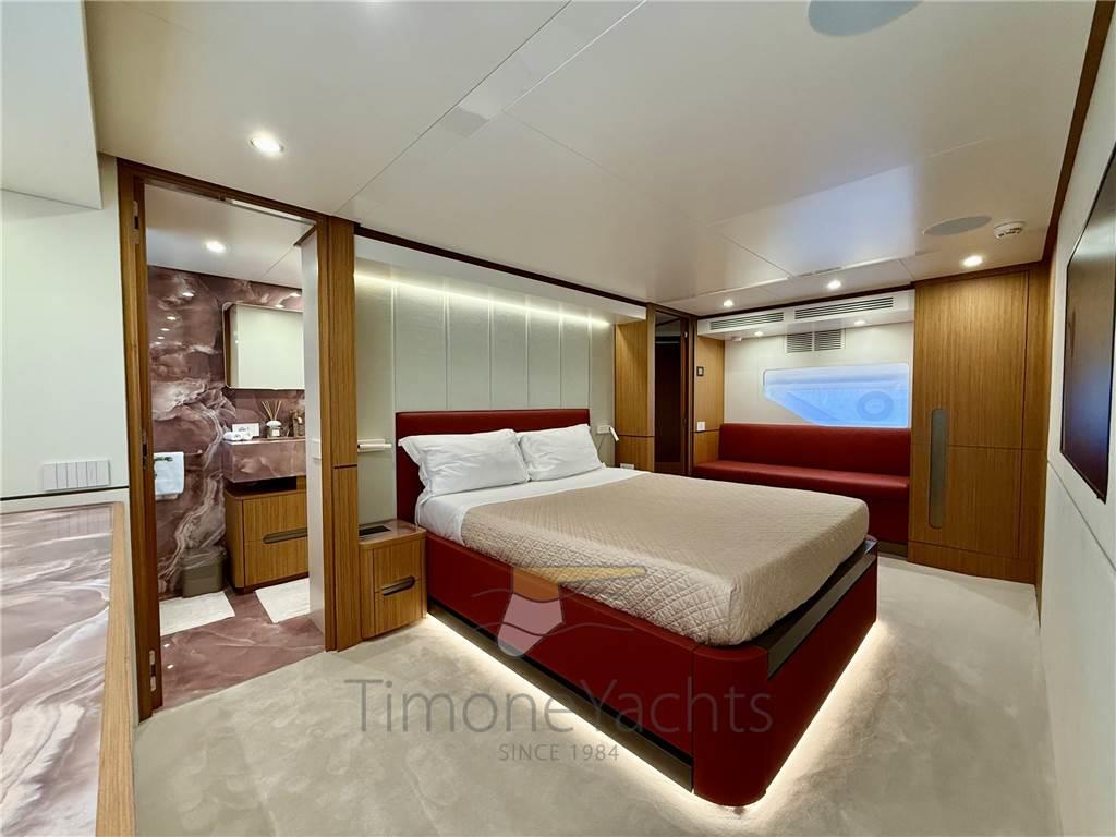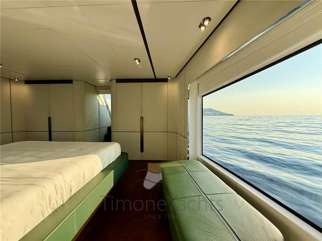 Il salone principale è una villa sull'acqua, con finestre così grandi che sarà difficile distinguere l'interno/esterno. L'enorme salone ha due nicchie a centro nave, che favoriranno l'imbarco dei vostri ospiti con stile se ormeggiati "all' inglese". Al main deck c'è chiaramente l'appartamento master dove, ebbene sì, c'è una porta a vetri apribile elettricamente che porta sul ponte esterno anteriore. Per non considerare l'ampio corridoio d'ingresso con cui inizia l'area padronale.
