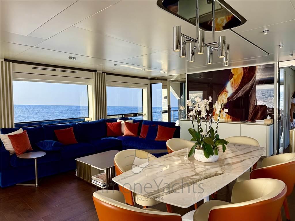 Una velocità di crociera continuativa di 18/19 nodi e una massimo di 25 nodi ti porteranno senza sforzo in tutto il Mediterraneo. La navigazione fluida da un flybridge straordinario, un unico ponte che si sviluppa tutto intorno al nucleo sociale dell'unità. Le zone pranzo, le aree prendisole, l'unità bar e i lussuosi mobili da esterno fluiscono insieme come raro trovare su uno yacht di queste dimensioni.
