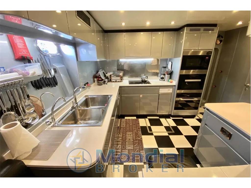La cucina principale, collocata tra la cabina armatoriale e la sala macchine, è completamente attrezzata con elettrodomestici Miele, piani di lavoro in acciaio e ampi frigoriferi Frigit.