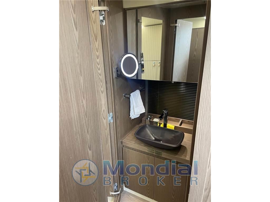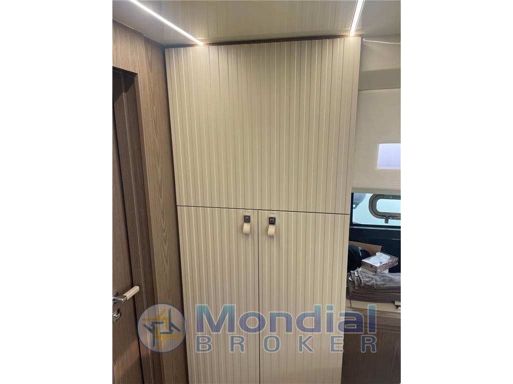 Allarme motore, Allarme sentina, Ancora, Angolo barra, Autoclave, Batterie, Bussola, Camminamenti laterali in teak, Caricabatterie, Cavo corrente di banchina, Comando motori elettronico, Doccia esterna, Ecoscandaglio, Elica di prua - bow thruster, Flap elettrici (Interceptor), Garage per tender, Hard top (Carbonio), Impianto antincendio, Indicatori Flaps, Joystick, Lavandino nel Pozzetto, Luci di cortesia, Luci subacquee, Monitor dei consumi, Parabordi, Passerella (idraulica a sfilo), Piattaforma (idraulica affondabile), Pilota automatico, 2 Plotter con antenna GPS, Pompa di sentina automatica, Pompa di sentina elettrica, Pozzetto Teak, Presa 220V banchina, Radio VHF, Salpa Ancore Elettrico, Scaletta da bagno, Sedile Copilota, Tavolo pozzetto, Tromba