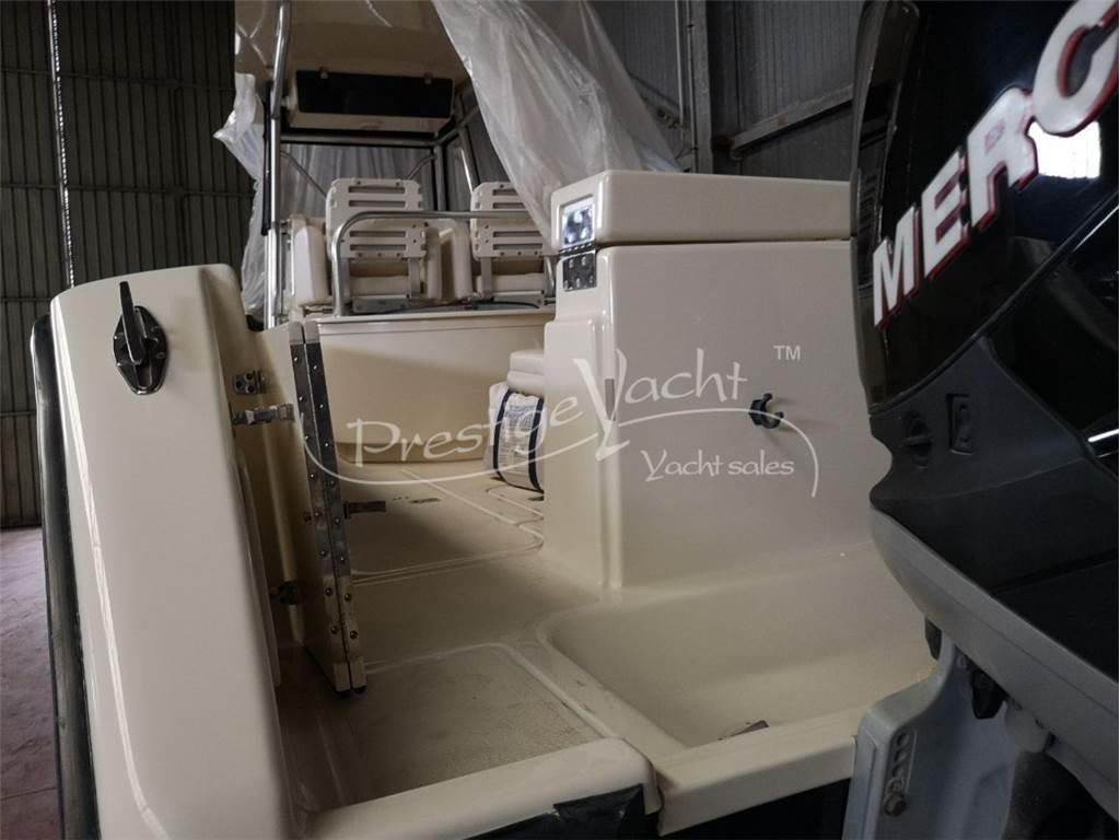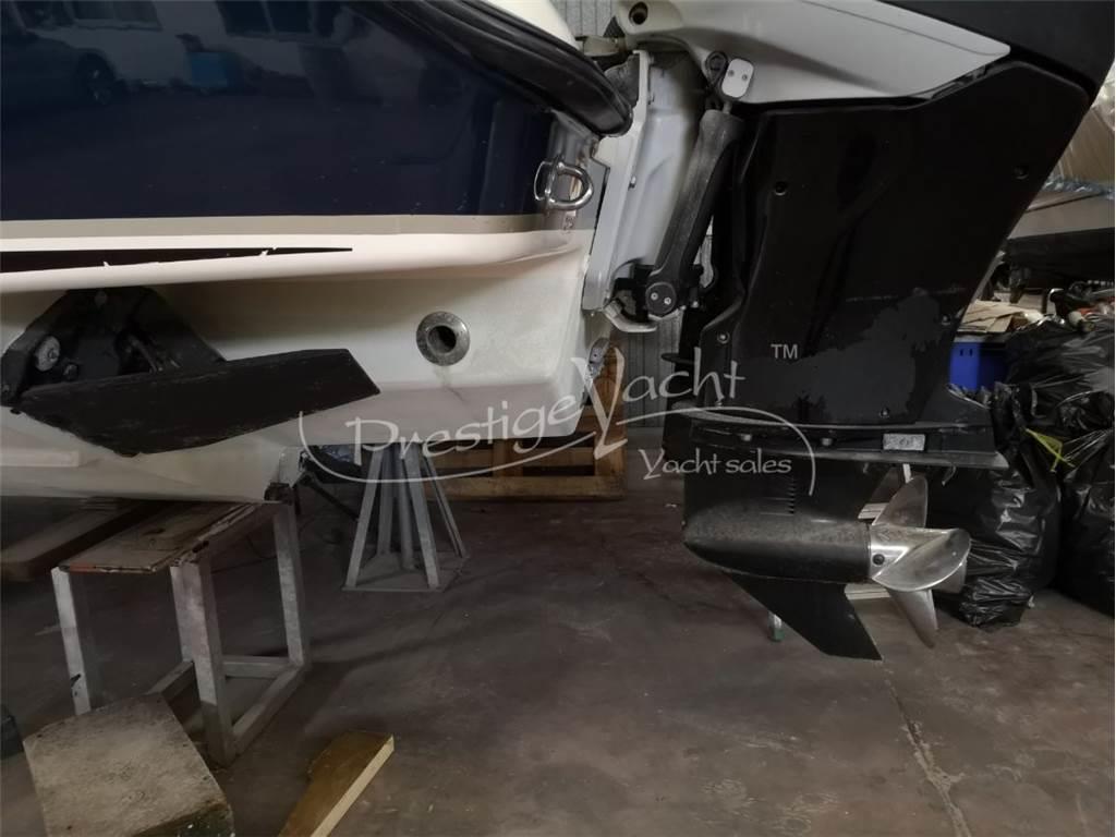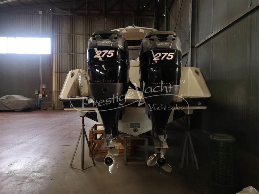 Panche abbattibili, Portacanne, Vasca del pescato, Vasca del vivo Allarme motore, Doccia esterna, Flap idraulici, Hard Top, Impianto antincendio, Indicatori flaps, Luci di cortesia, 2 Pompa di sentina automatica, Presa acqua banchina, Salpa ancora elettrico, Scaletta da bagno, Tromba Ghiacciaia Prese interne 12V Altoparlanti, Stereo Bussola, Comando motori elettronico, Contamiglia, Ecoscandaglio, GPS, Pilota automatico, Plotter, Radar, Radio VHF Cuscineria di poppa, Cuscineria di prua, Cuscineria pozzetto, Telo copri consolle, Tendalino