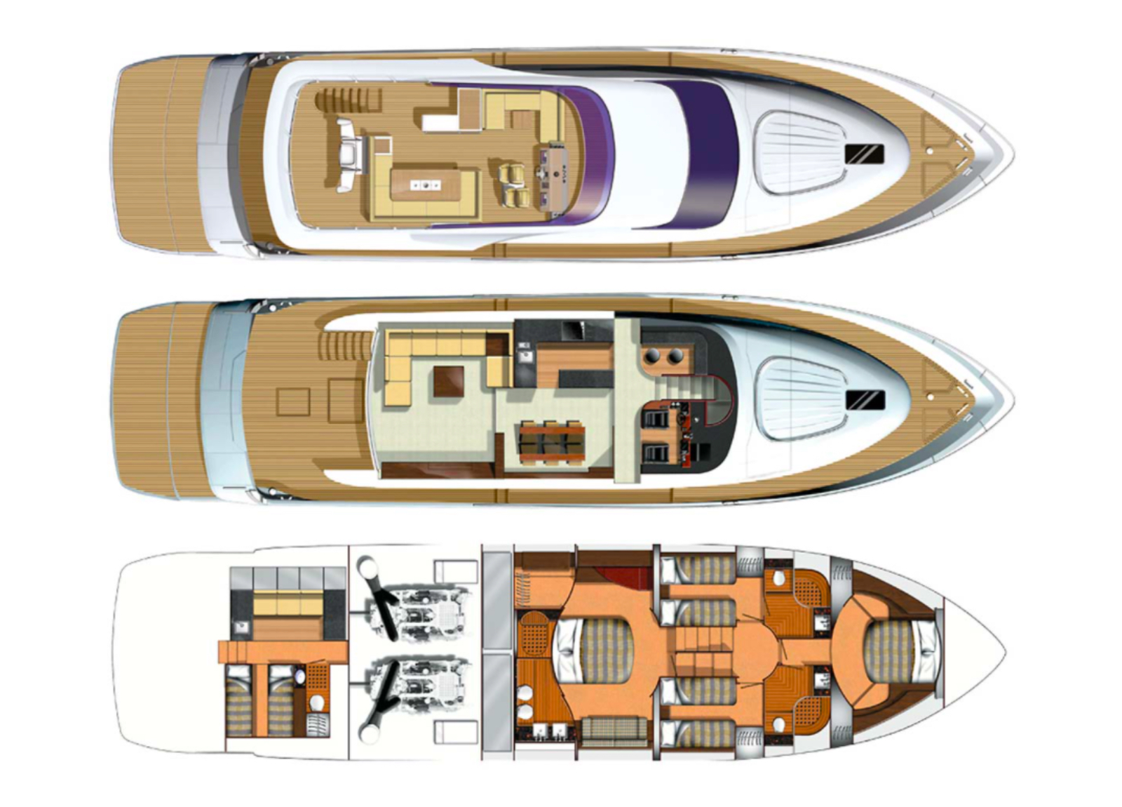 Versione 4 cabine doppie in piano, 3 servizi, cucina chiusa e doppia cabina per l'equipaggio.