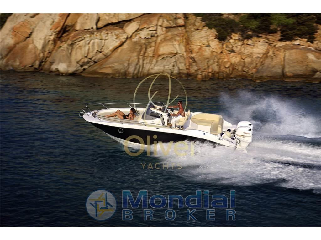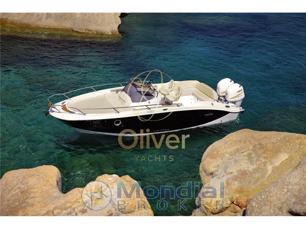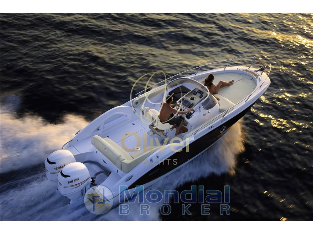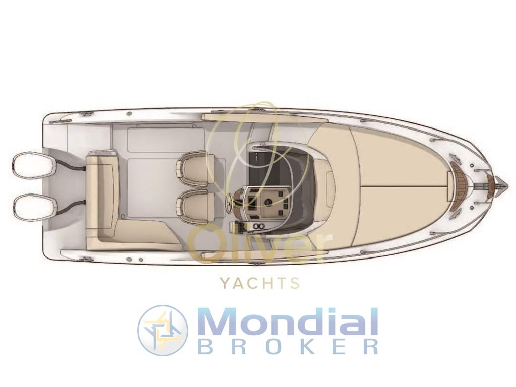 L’equipaggiamento standard è ricco e funzionale: nel pozzetto troviamo cuscineria anti-UV e resistente all’acqua, divano ad “L” riconfigurabile in prendisole, zona pic-nic con lavello, piastre di cottura e frigo sotto il sedile pilota, oltre a tendalino a scomparsa, gavoni portaoggetti e scaletta bagno. La consolle è curata nei dettagli, con pannello tridimensionale, bussola, volante in acciaio/pelle e sedili sportivi separati.