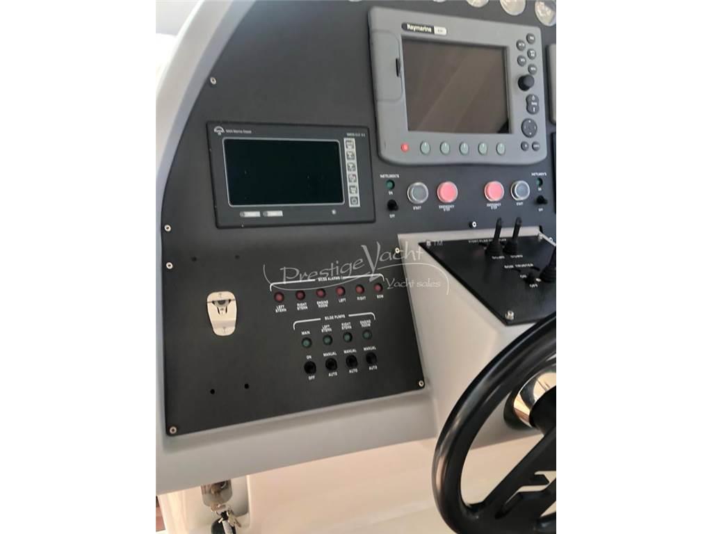 Allarme motore, Autoclave, Autogonfiabile, Caricabatterie, Doccia esterna, Elica di prua, Faro orientabile, Flap idraulici, Hard Top, Impianto antincendio, Indicatori flaps, Luci di cortesia, Passerella (idraulica), Piattaforma, Pompa di sentina automatica, Pompa di sentina manuale, Porta di ingresso, Pozzetto in teak, Presa 220V banchina, Presa acqua banchina, Rollbar, Salpa ancora elettrico, Scaletta da bagno, Tavolo in pozzetto, Tender (+FB), Winch tonneggio di poppa congelatore, Cucina, Frigorifero esterno, Frigorifero interno, Ghiacciaia, Lavastoviglie, Microonde, Piastra in vetroceramica Boiler, Cassaforte, Dissalatore, Impianto acque nere, Inverter, Prese interne 12V, Prese interne 220V, 3 Wc marino elettrico Altoparlanti, Antenna satellitare, Decoder satellitare, Digitale terrestre, Impianto TV, Stereo, TV Angolo barra, Bussola, Comando motori elettronico, Contamiglia, DSC vhf, Ecoscandaglio, GPS, Pilota automatico, Plotter, Radio VHF Copripozzetto, Cuscineria di poppa, Cuscineria di prua, Teli copri finestra, Telo copri consolle, Tendalino