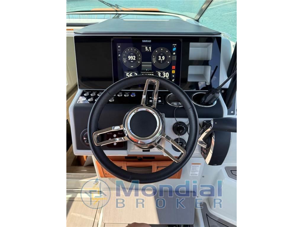 Bussola, Comando motori elettronico, DSC vhf, Ecoscandaglio, GPS, Luci di navigazione, Plotter con antenna GPS (Simrad 12"), Sedile Copilota.