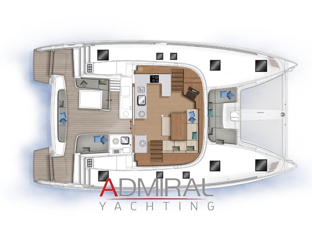 Lo studio VPLP design ha saputo rinnovare gli equilibri tra le varie aree living. Il Lagoon 46 accosta prendisole modulabili a poppa e prua, una cucina completa a poppa, un accesso al mare pratico e sicuro, pur conservando nel quadrato dei grandi volumi in cui Nauta Design può trovare piena espressione.