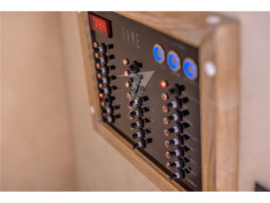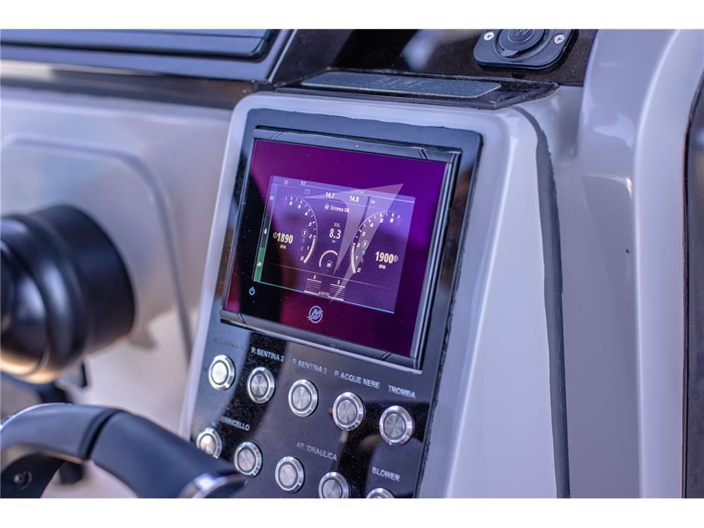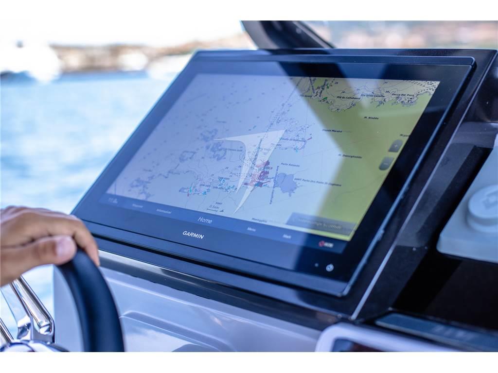 Bussola, Computer di bordo, Contametri catena (con catema 50m acciaio zincato di 8 mm), Contamiglia, Display, Ecoscandaglio, GPS, Joystick, Pilota automatico, Plotter con antenna GPS, Radar, Radio VHF, Sedile Copilota.