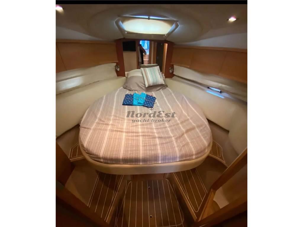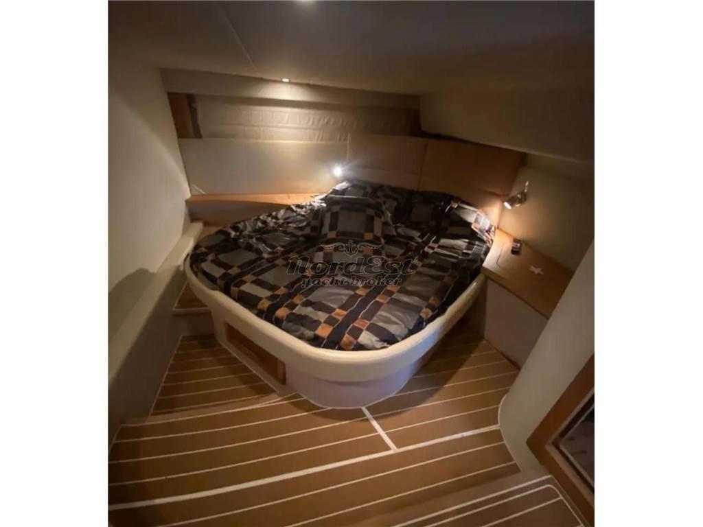 Gli interni sono lussuosi e ben rifiniti, con cabina di prua dotata di letto matrimoniale e bagno con doccia, cabina armatoriale a poppa a tutto baglio con letto matrimoniale, armadio e bagno con doccia, dinette con divano trasformabile in letto matrimoniale e bagno, cucina completa con lavabo e piano di appoggio in acciaio inox, forno multifunzione, piano cottura, frigorifero da 35 litri e tavolo in legno trasformabile in letto. I pavimenti sono in rovere e i mobili in laccato satinato bianco.