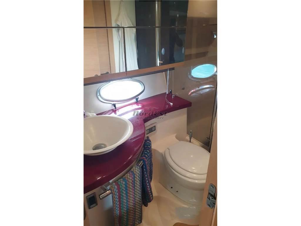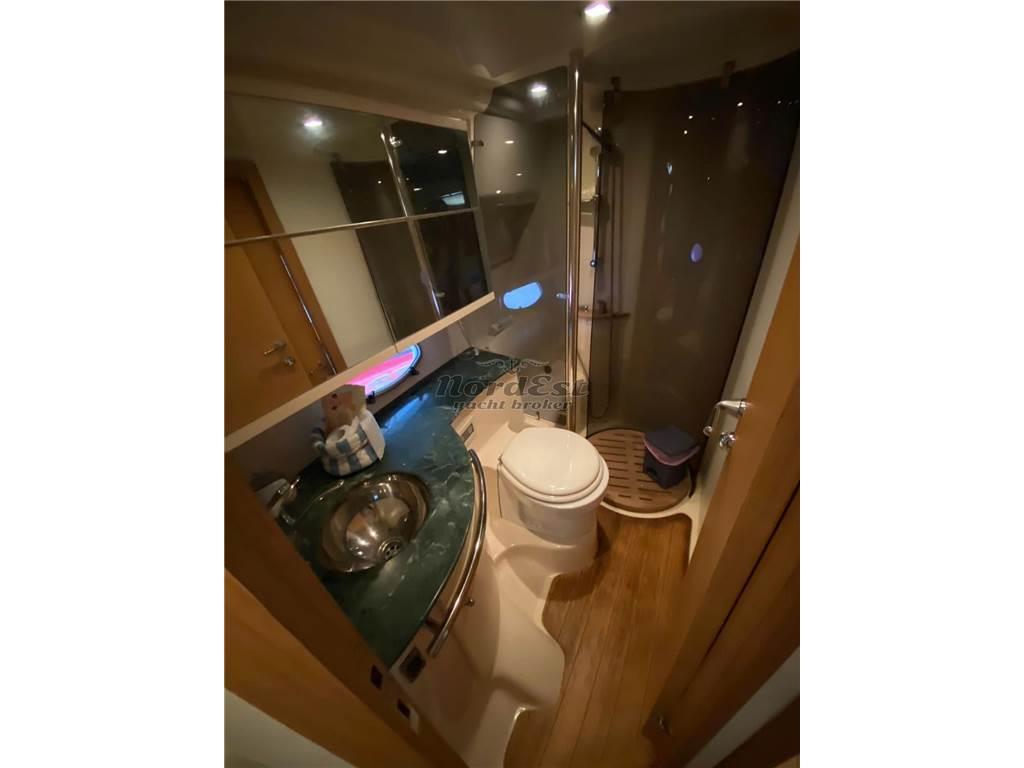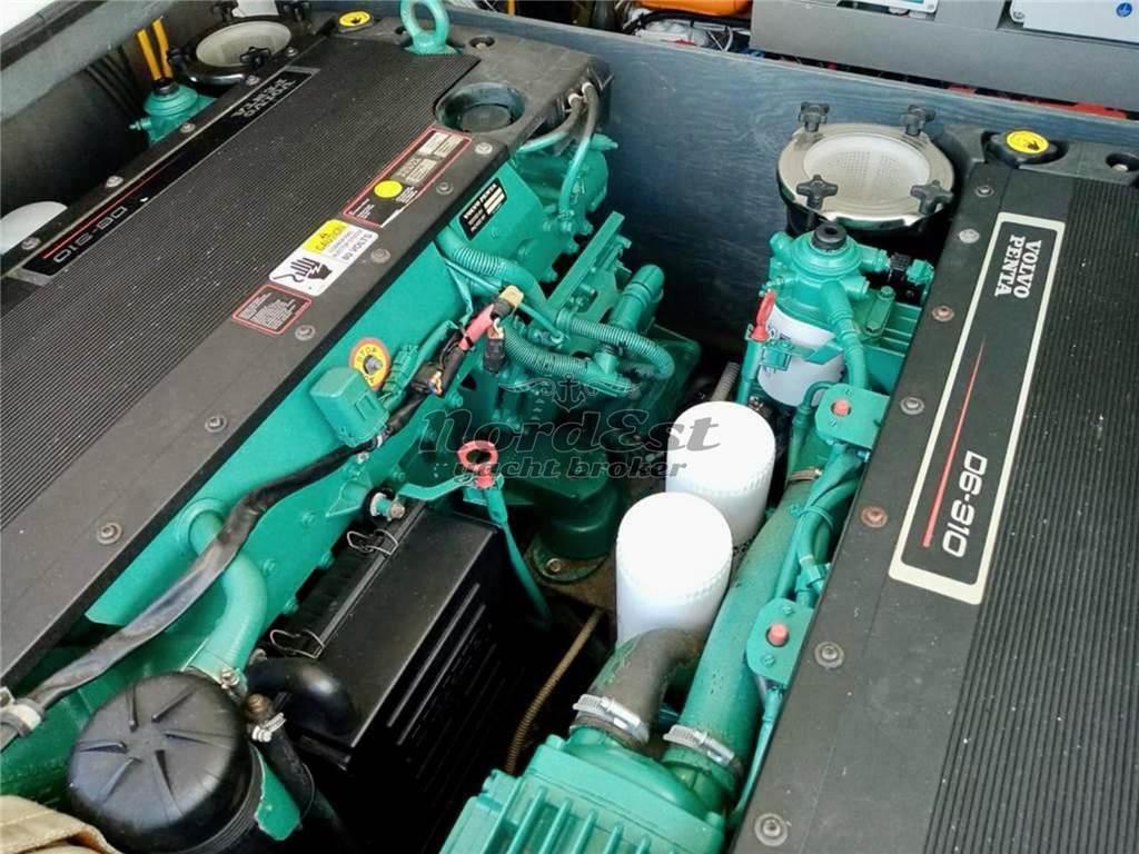 Questa imbarcazione è equipaggiata con due potenti e affidabili motori Volvo Penta D6 da 310 CV ciascuno, con sole circa 800 ore di moto. I piedi poppieri DPH con eliche controrotanti in nibral, noti per le loro affidabilità e prestazioni superiori, garantiscono una navigazione fluida e precisa in ogni condizione. La strumentazione di bordo è completa e include timoneria idraulica, manette elettroniche, elica di prua, GPS ed eco Raymarine, contacatena Quick con comandi ripetuti a prua, tridata Raymarine, controllo elettronico dei flap.