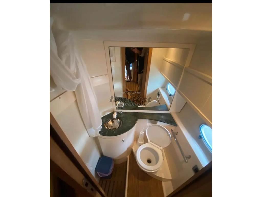 Il pozzetto offre un comodo divano a C con tavolo regolabile, frigo a pozzetto, lavabo, mobile ripostiglio e pavimentazione in teak. A poppa si trovano il garage tender con gommone e motore, i prendisole matrimoniali nuovi, la passerella elettrica Besenzoni a scomparsa e la scaletta di risalita a scomparsa in inox, oltre al tendalino posteriore privacy. Tagliando completo di motori, generatore, aria condizionata e piedi, inclusi gli scambiatori, i paraoli assi e i parastrappi eliche nuovi, e l'antivegetativa è stata effettuata a febbraio 2025. La barca è tenuta "maniacalmente" bene.