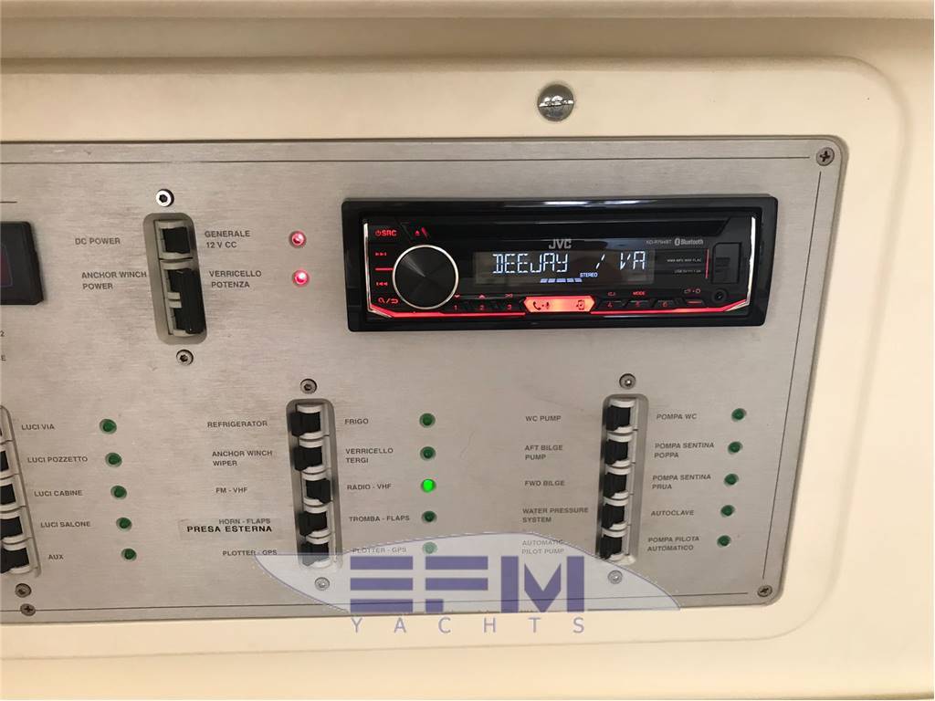 Strumentazione analogica completa Vdo per controllo parametri motori , temperatura olio acqua contagiri e contamiglia - antenna GPS - Antenna vhf - Radio stereo JVC con bluetooth telecomando e altoparlanti in pozzetto - Manette morse meccaniche - comando flaps idraulici - Elica di manovra a prua 2019 - RADIO VHF GARMIN 2019- comando passerella idraulica - Salpancora con contacatena in timoneria -