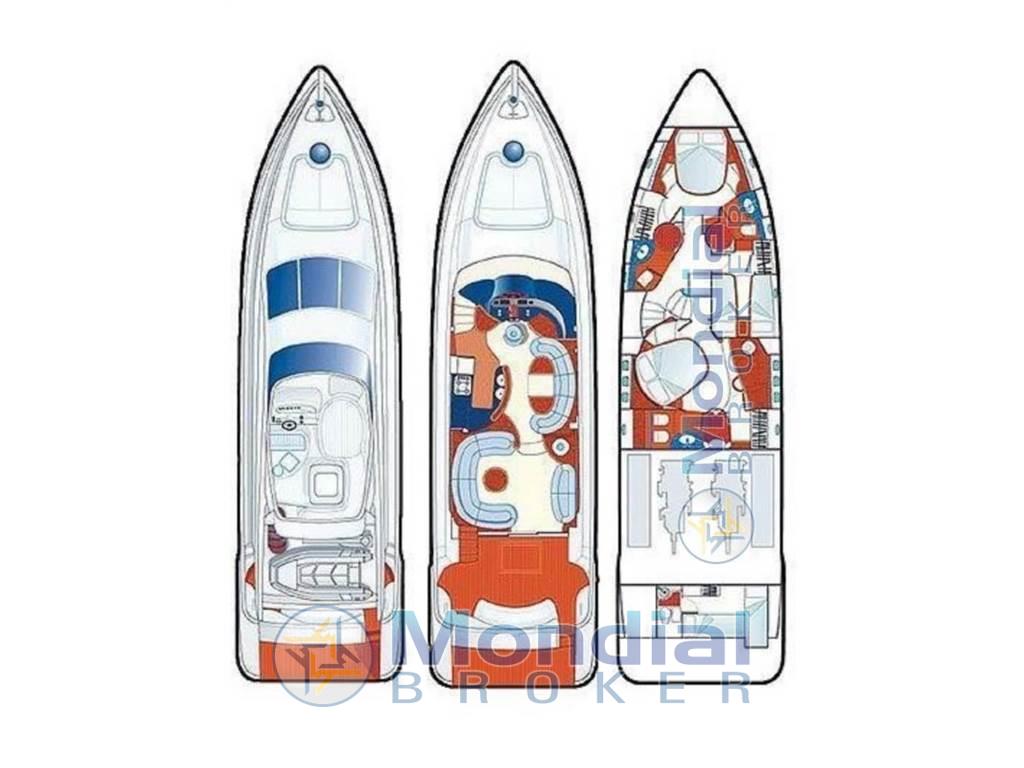 1 Matrimoniale italiana, 1 Doppia in piano, 1 Cabina equipaggio, 1 Dinette, 1 Cucina, 1 Salone, 1 Toilette Equipaggio, 3 Toilette doccia no bidet, 1 Matrimoniale a V di prua