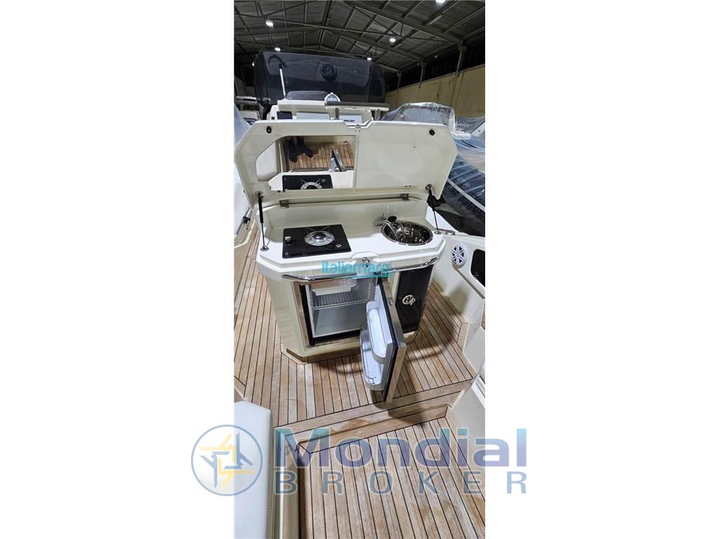Acqua Calda, Altoparlanti, Boiler, Controllo Domotica, Cuscineria completa, Cuscineria di poppa, Cuscineria di prua, Cuscineria Pozzetto, Dotazioni di sicurezza entro 6 miglia, Fornello (+ lavello esterno), Frigorifero esterno, Impianto acque nere, Indicatore del serbatoio del carburante, Indicatore del Serbatoio dell’Acqua, Serbatoio Acque Nere, Stereo, Tendalino (estraibile fino alla consolle), WC marino elettrico (con doccia interna e lavabo)