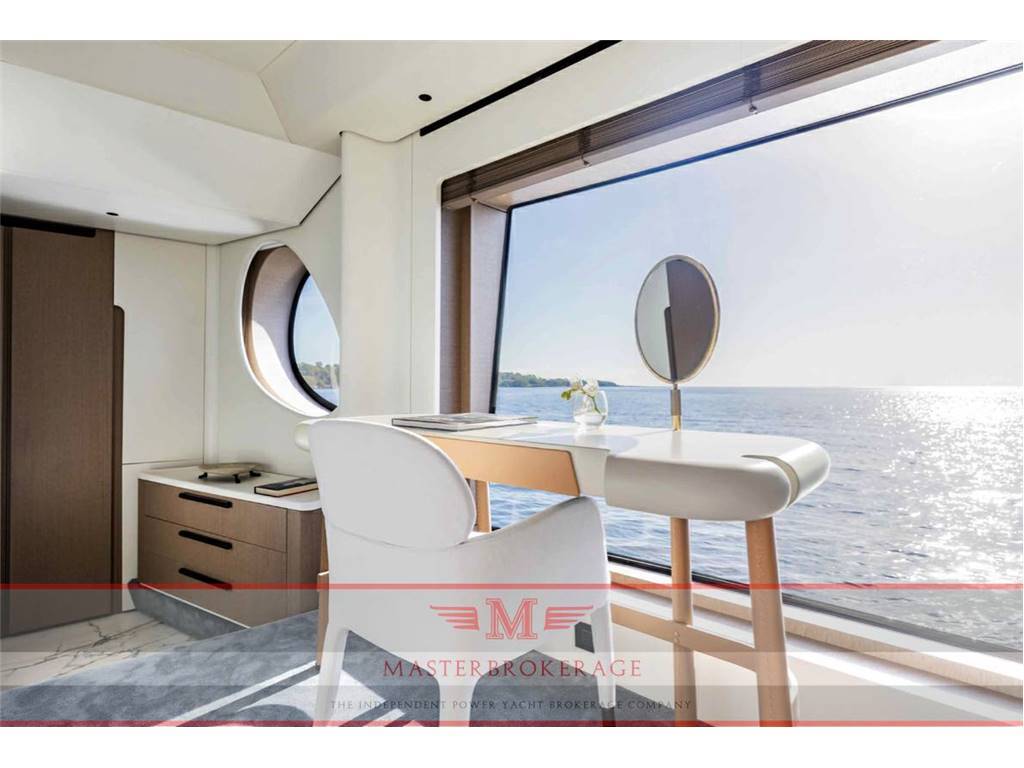 A full-size table for ten guests is served by an American bar and an extra storage cabinet, under the variable shelter of the opening hardtop. The designers chose to forgo the fully raised pilot house in favor of an elongated flybridge named Maxi Fly, which expands the seating arrangement forward to create a more intimate corner flanking the helm.