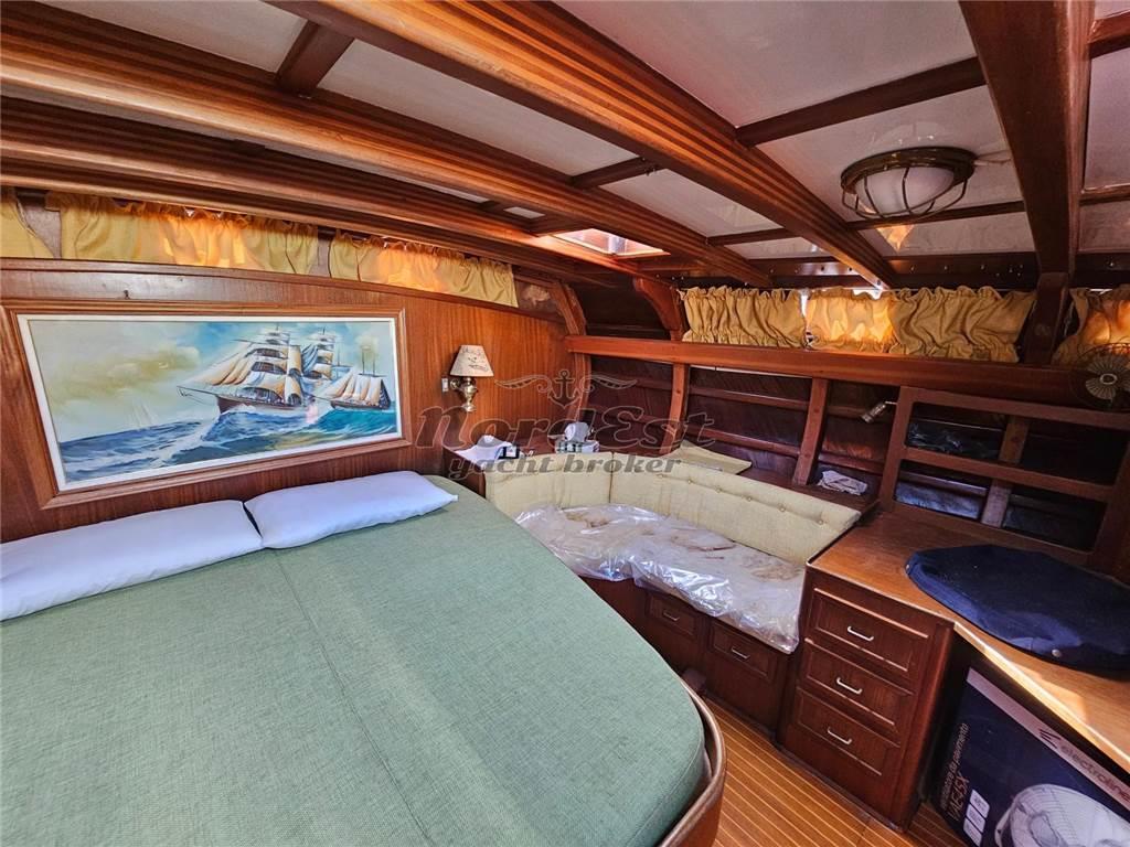 Splendida goletta in legno lamellare di mogano, dalla linea slanciata e raffinata: una vera “matita” dei mari. La cabina di poppa a tutto baglio, separata dalle altre cabine, offre il massimo della privacy e del comfort.