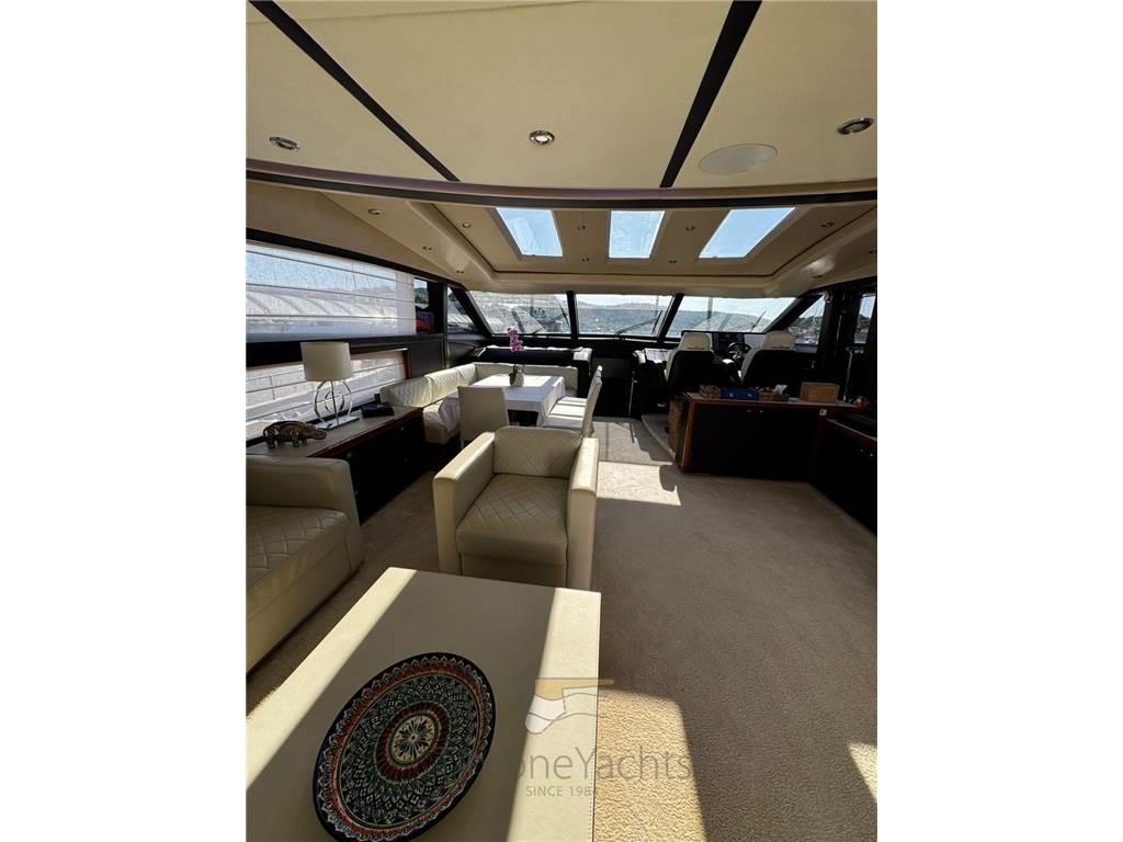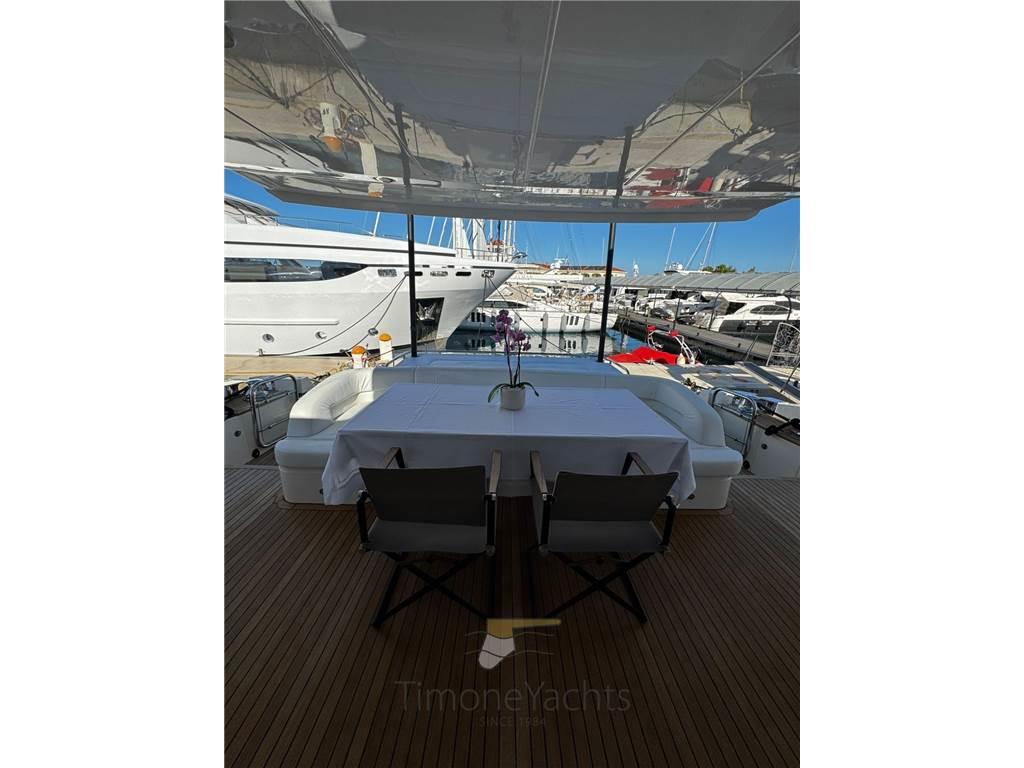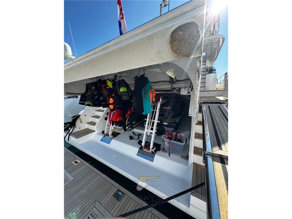 Alternatore, Camminamenti laterali in teak, Cavo corrente di banchina, Doccia esterna, Doppia timoneria, Elica di poppa - stern thruster, Elica di prua - bow thruster, Faro orientabile, Flap idraulici, Garage per tender, Hard top, Impianto antincendio, Indicatori Flaps, Lavaggio catena, Luci di cortesia, Piattaforma, Pompa Lavaggio Ponte, Ponte in teak, Porta laterale, Pozzetto Teak, Presa 220V banchina, Tavolo pozzetto, Tromba, Winch tonneggio di poppa, Winch tonneggio di prua.