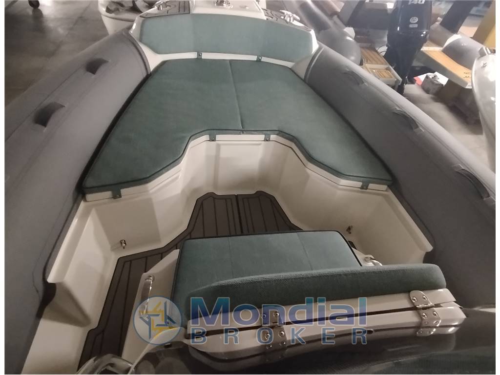 Kit sospendite per alaggio, Rivestimento pavimento in EVA colorazione Slate Gray/Black, roll-bar inox con luci di via led e tendalino estensibile, prolunga prendisole prua, tavolo con prolunga poppa con cuscino, sedile cucina con frigorifero e lavello inox, variante colorazione cuscineria Fjord, variante colorazione tubolari Neptune carbon, verricello 700w con musone vtr, cima, catena e ancora inox